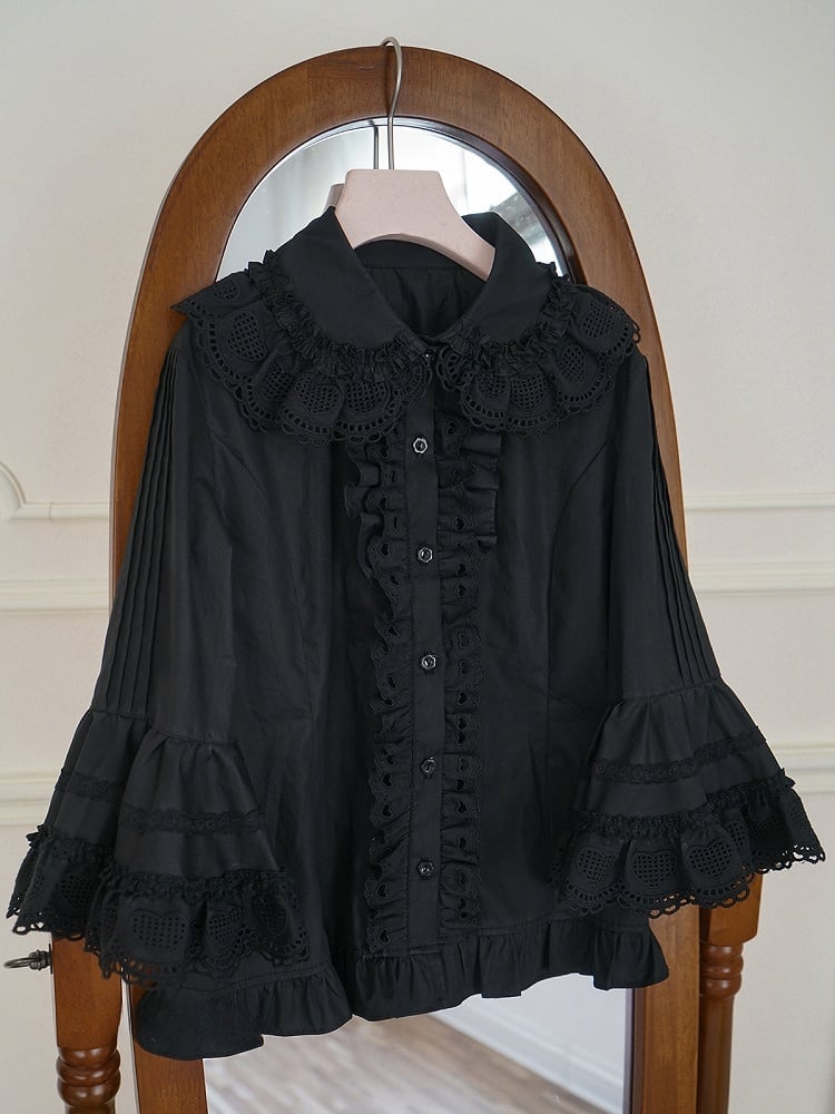 ブラック ラウンドフラットカラー ベルスリーブ コットンブラウス