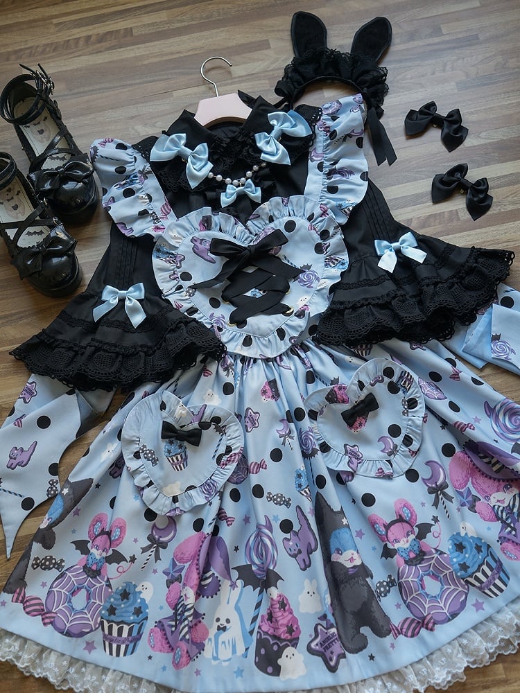 青と白のオールドスクールロリータファッションドレス 蝶結びディテール JSK セット