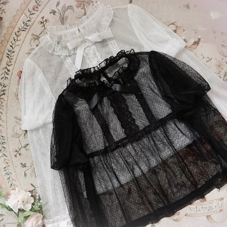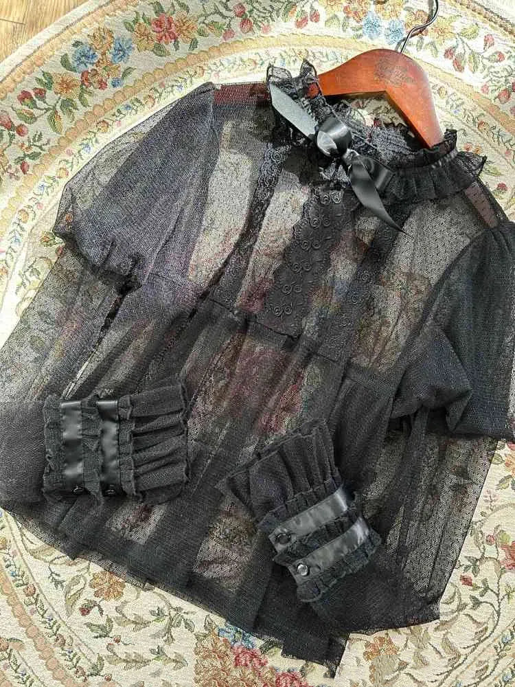 ブラックのフリルネックライン、ジュリエットスリーブ、シアーブラウス