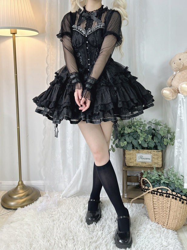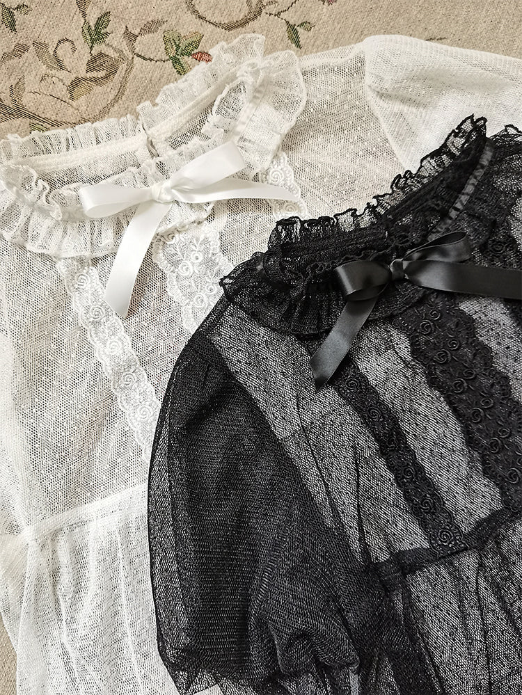 この愛らしいシアーブラウスは、ブラックのフリルネックラインとジュリエットスリーブが特徴で、どんな装いにも甘さを添えてくれます。キュートでチャーミングなルックにぴったりです。