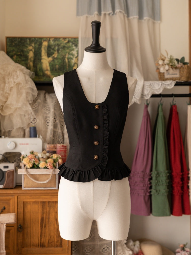 ブラックのフリルトリム、フロントボタンプラケットウエストコート