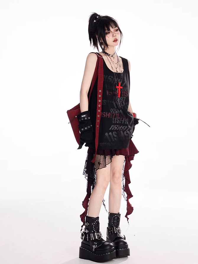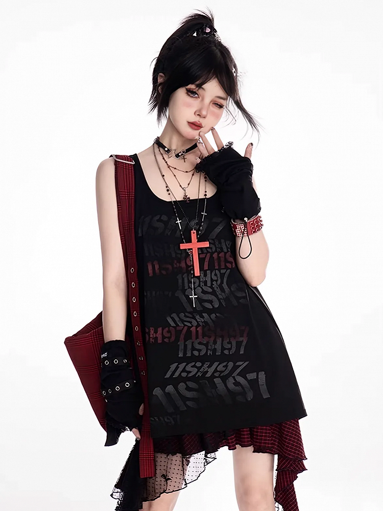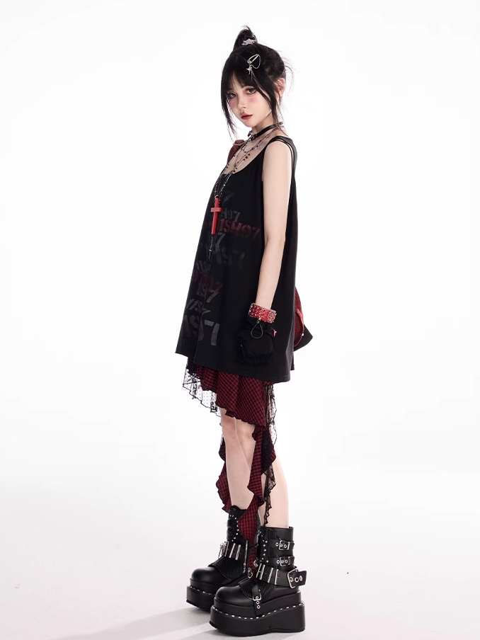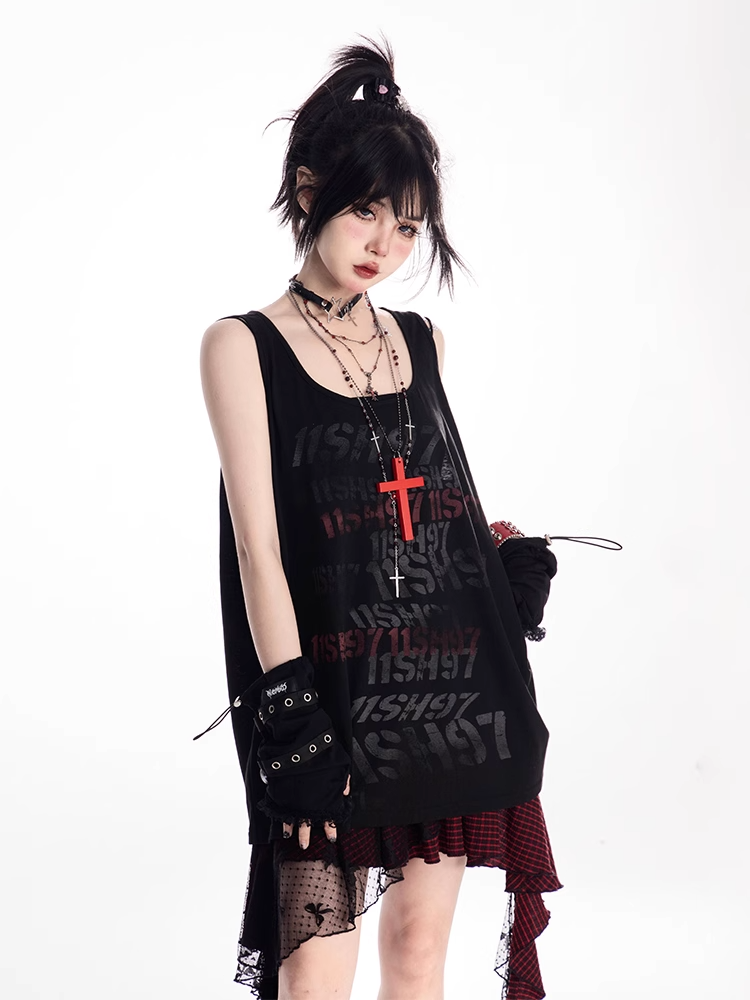 ブラック スクープネックライン レタープリント ヴィンテージ ルーズタンクトップ
