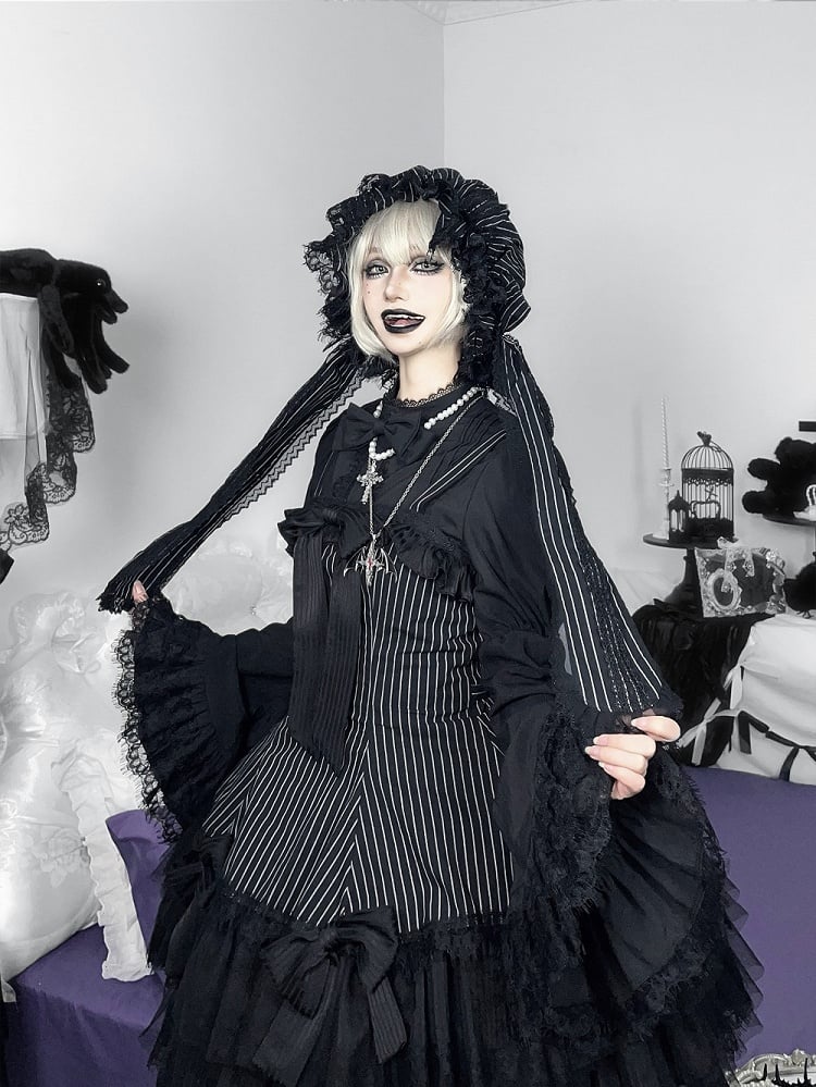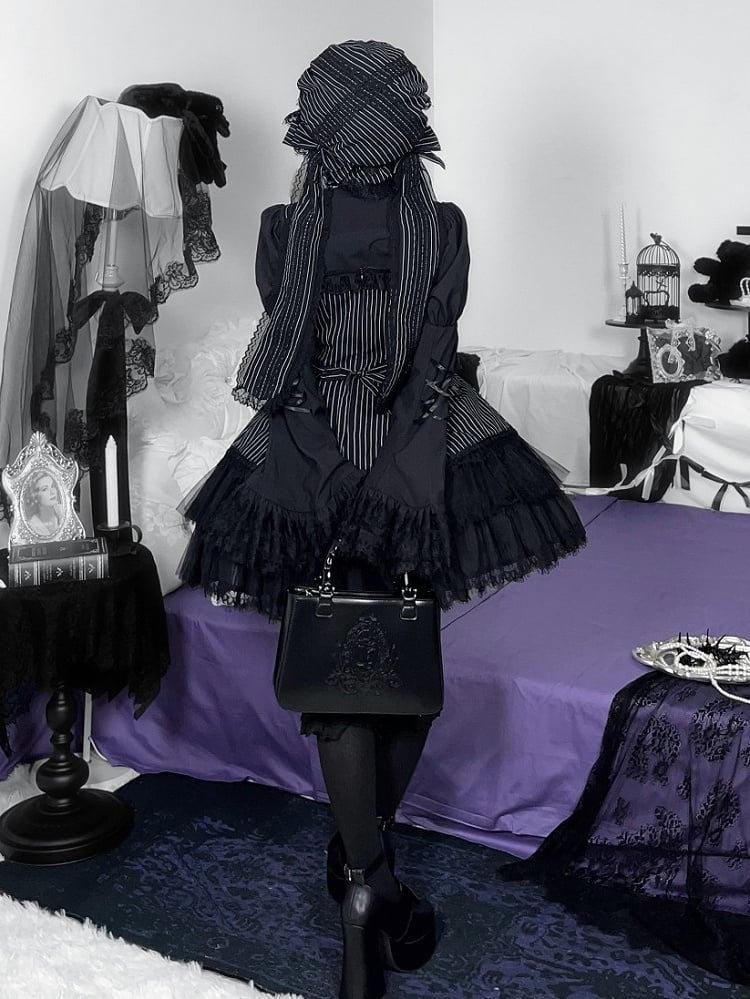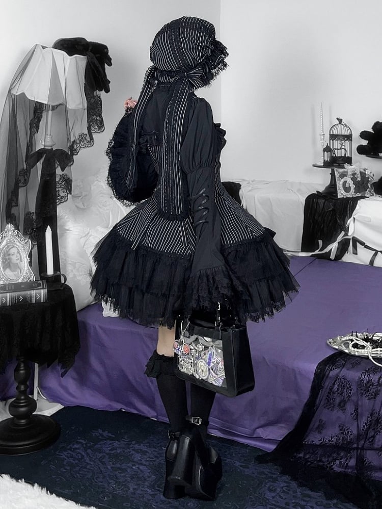黒のストライプのリボンで飾られた二重裾のゴシックロリータジャンパースカート