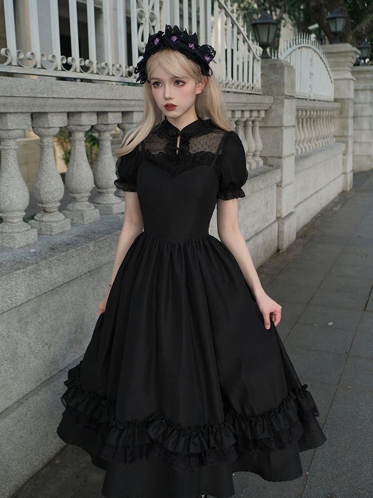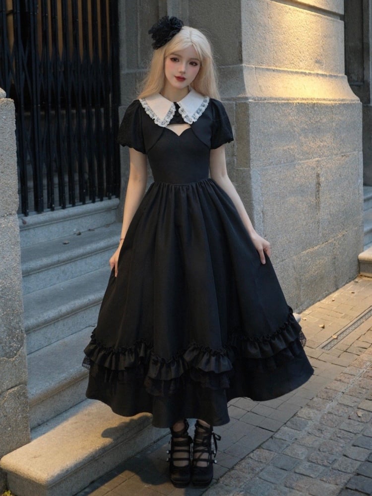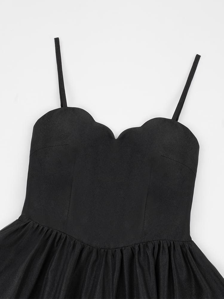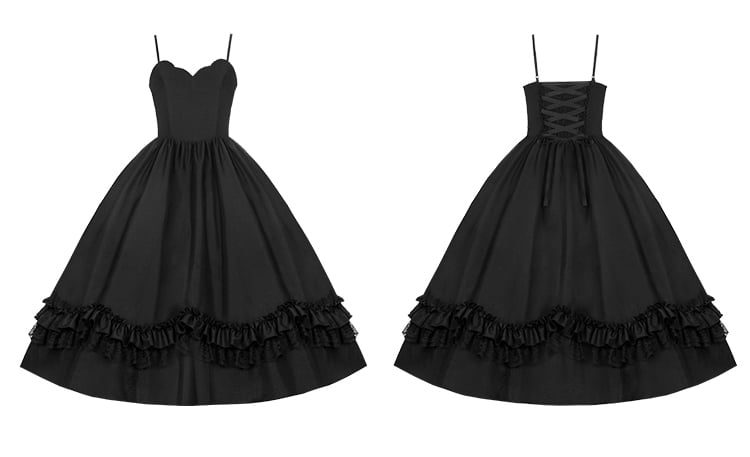 細めのショルダーストラップとスカラップエッジのネックラインがキュートなブラックのクラシックロリータドレス。その可愛らしさに心酔してください。繊細なショルダーストラップと魅力的なスカラップエッジのネックラインが、このクラシックなドレスにエレガントな雰囲気を添えています。どんなシーンにもぴったりのこのドレスは、あなたを美しく、そして気分も高揚させてくれるでしょう。