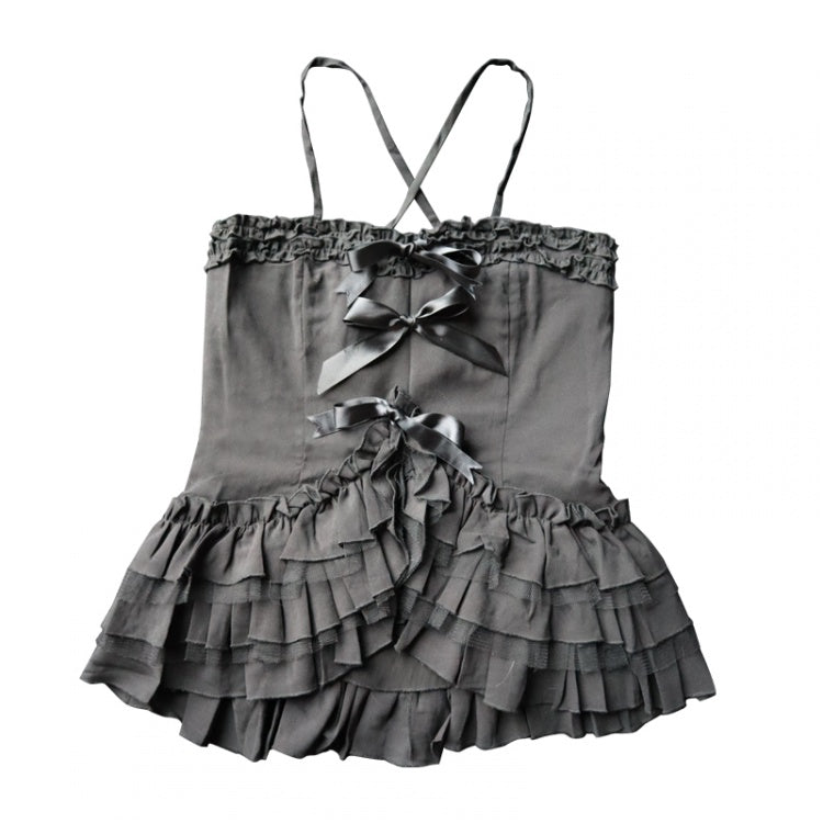 リボン結びのブラックティアードフリルヘムトップス
