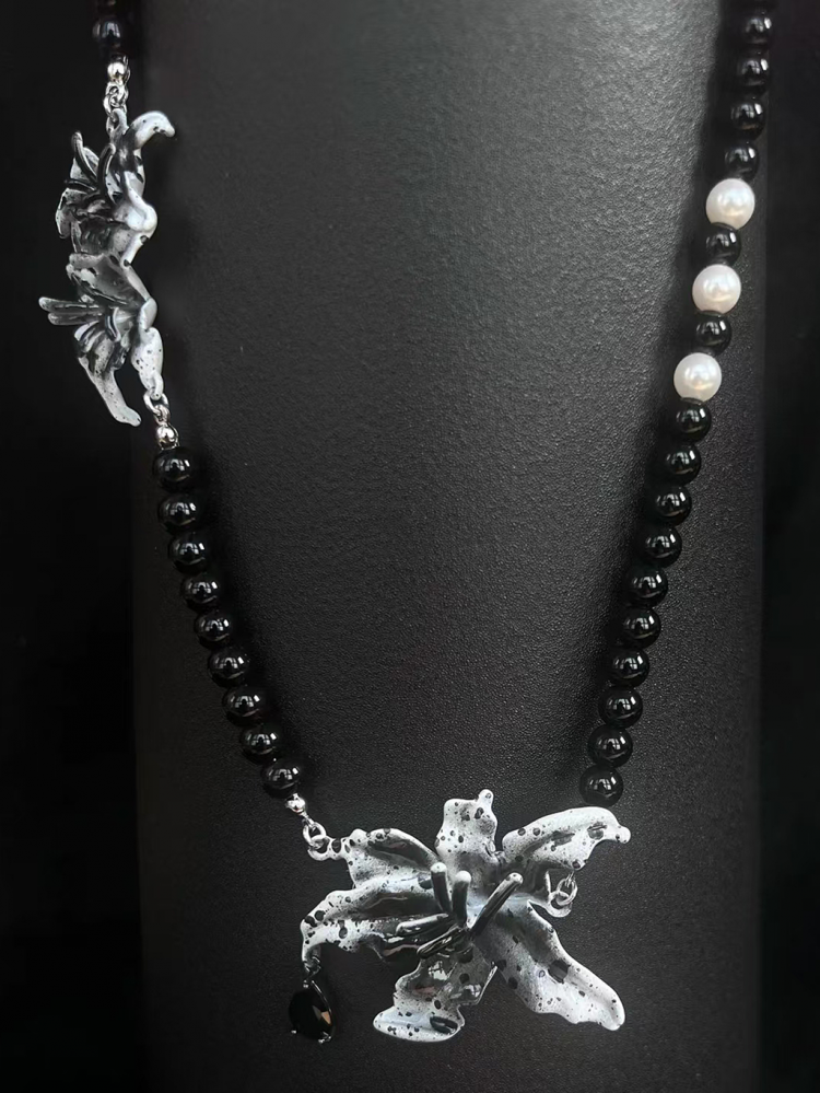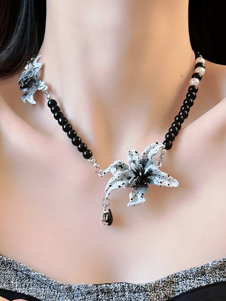 チャイナドレスにインスパイアされた白黒の花柄が特徴的な、愛らしいビーズネックレス。どんな装いにも華やかさを添えてくれる、ユニークでスタイリッシュなアクセサリーで、装いをワンランクアップさせましょう。