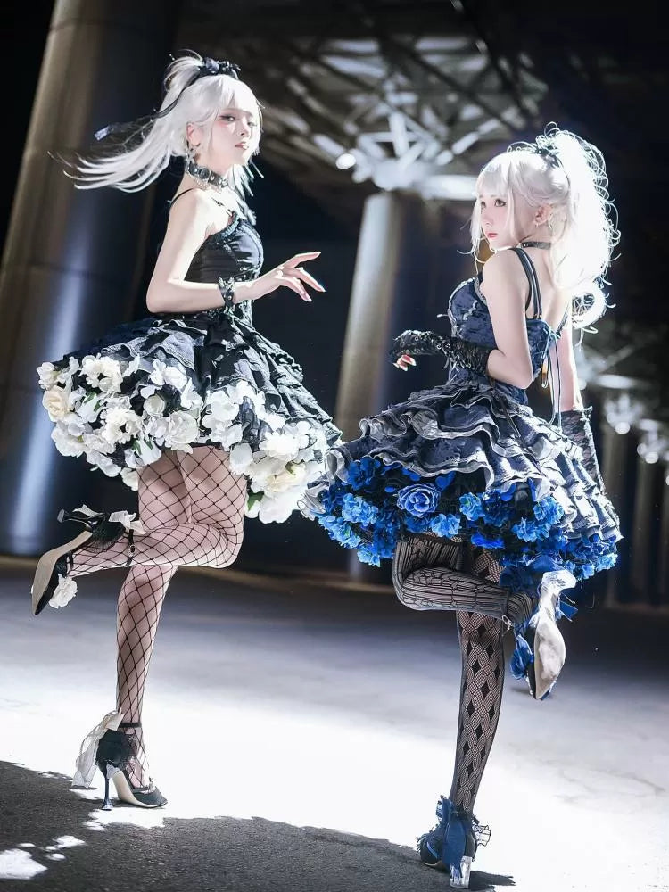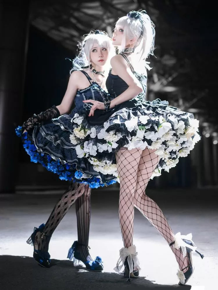 青と白のオールドスクールロリータファッションドレス 蝶結びディテール JSK セット