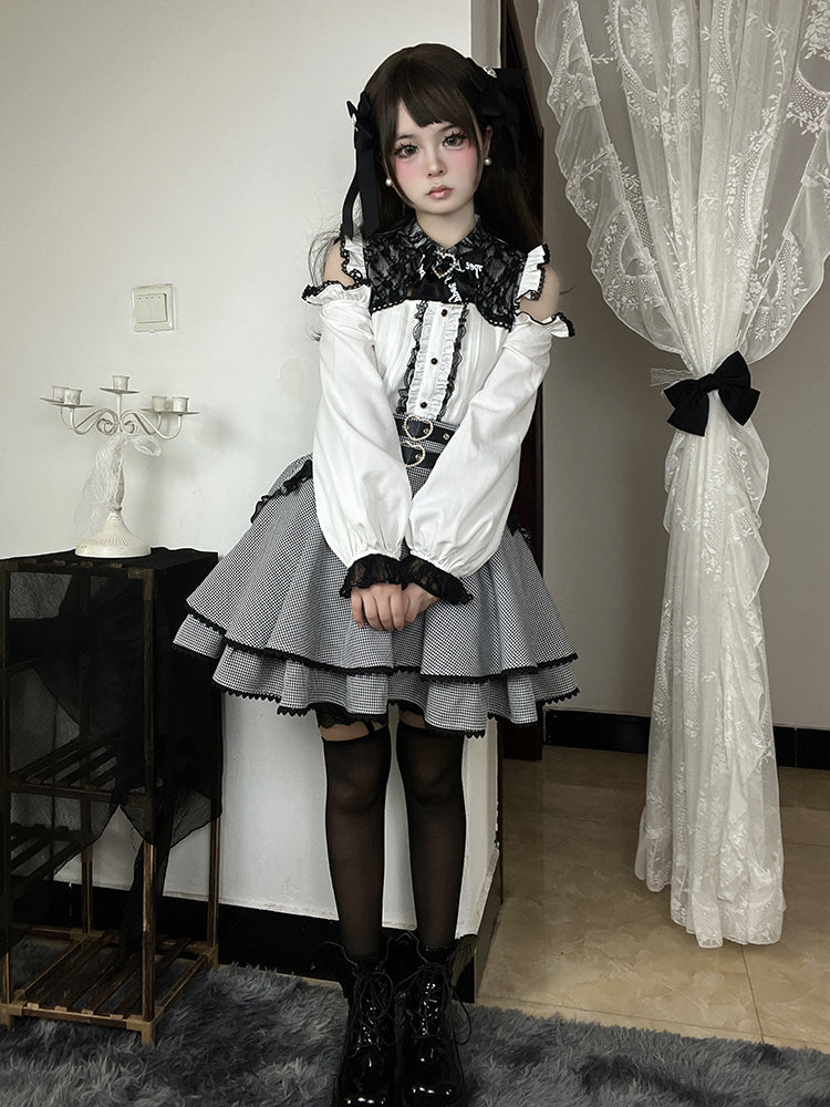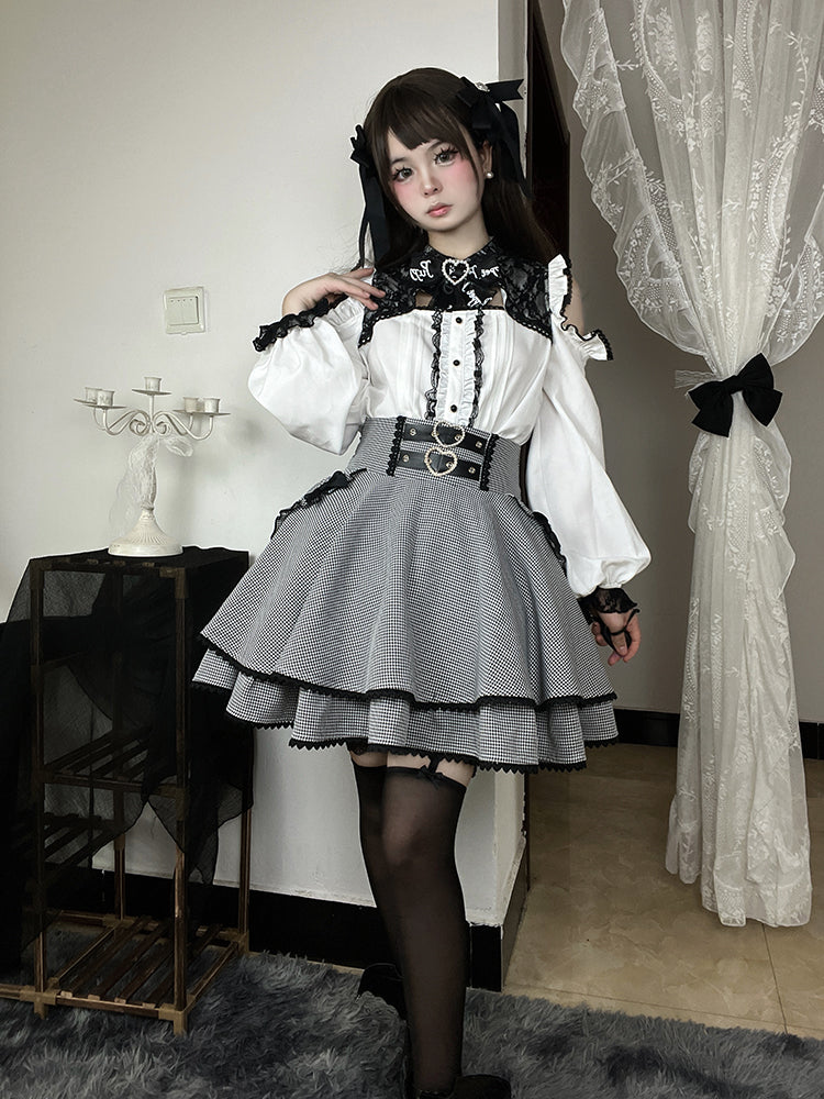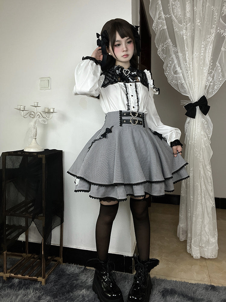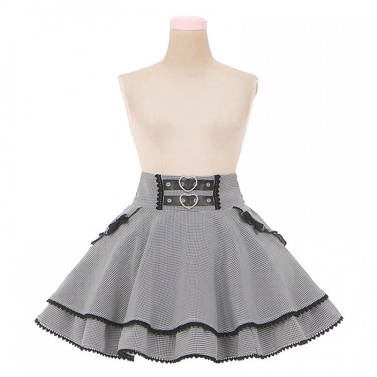 ブラック&ホワイトの千鳥格子柄ダブルハートバックルリボンボウノットジライケイティアードスカート