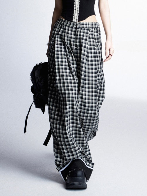 ブラック&ホワイトのチェック柄ローウエストストレートレッグパンツ