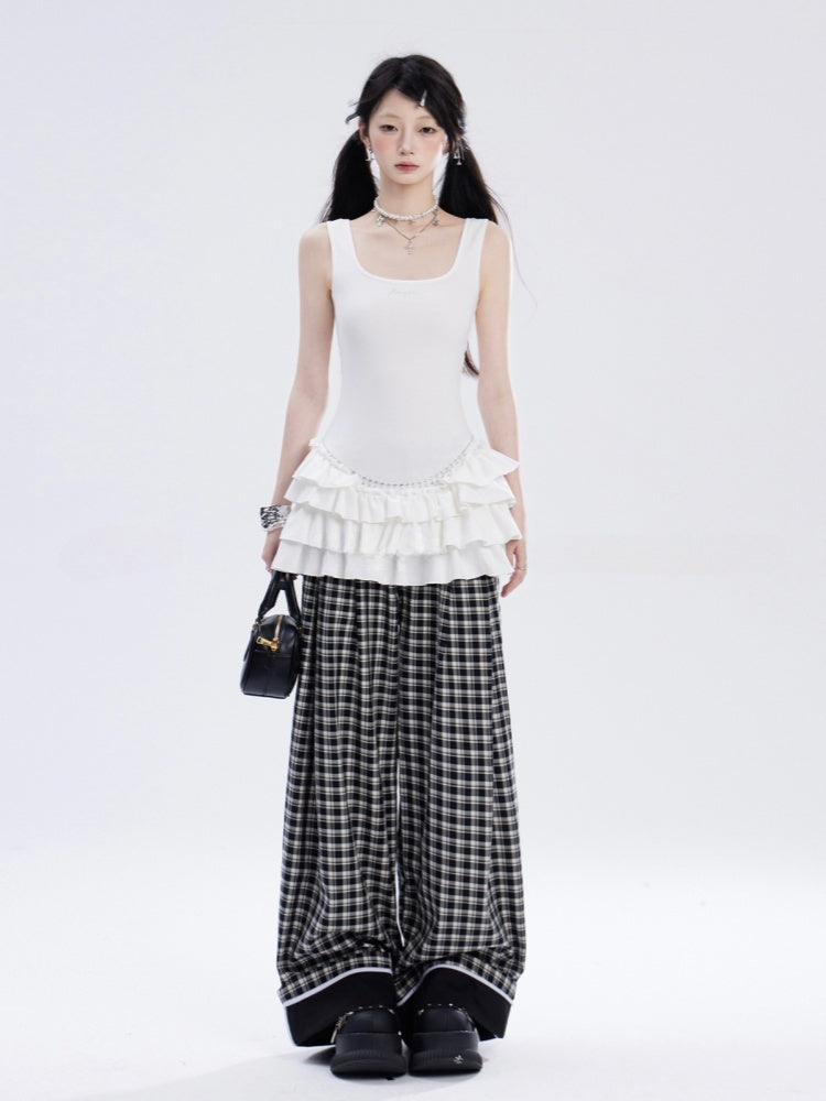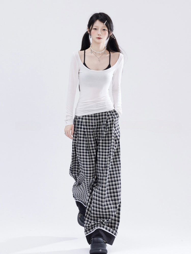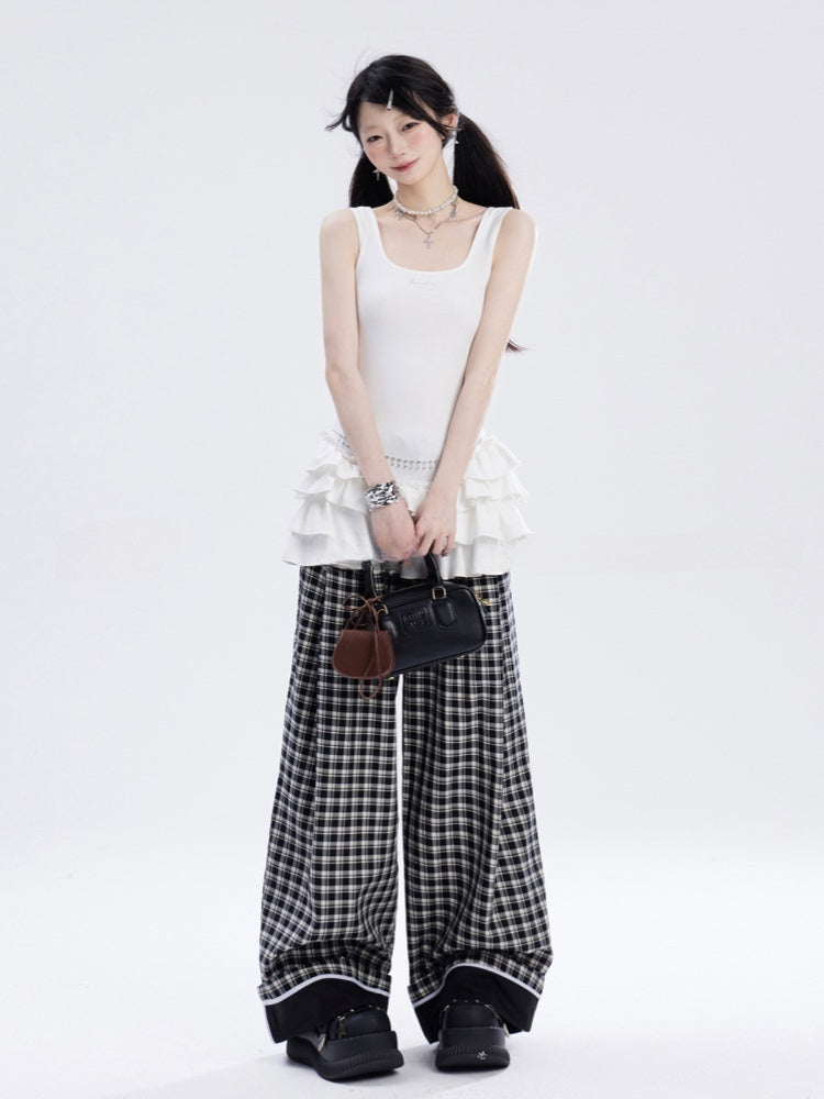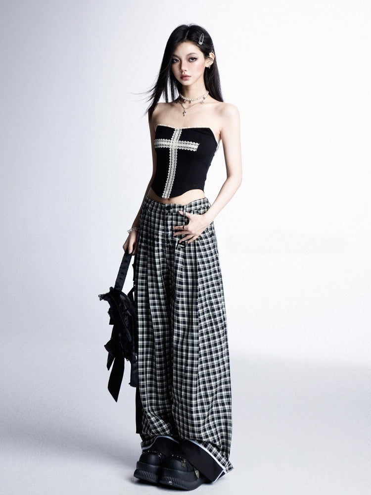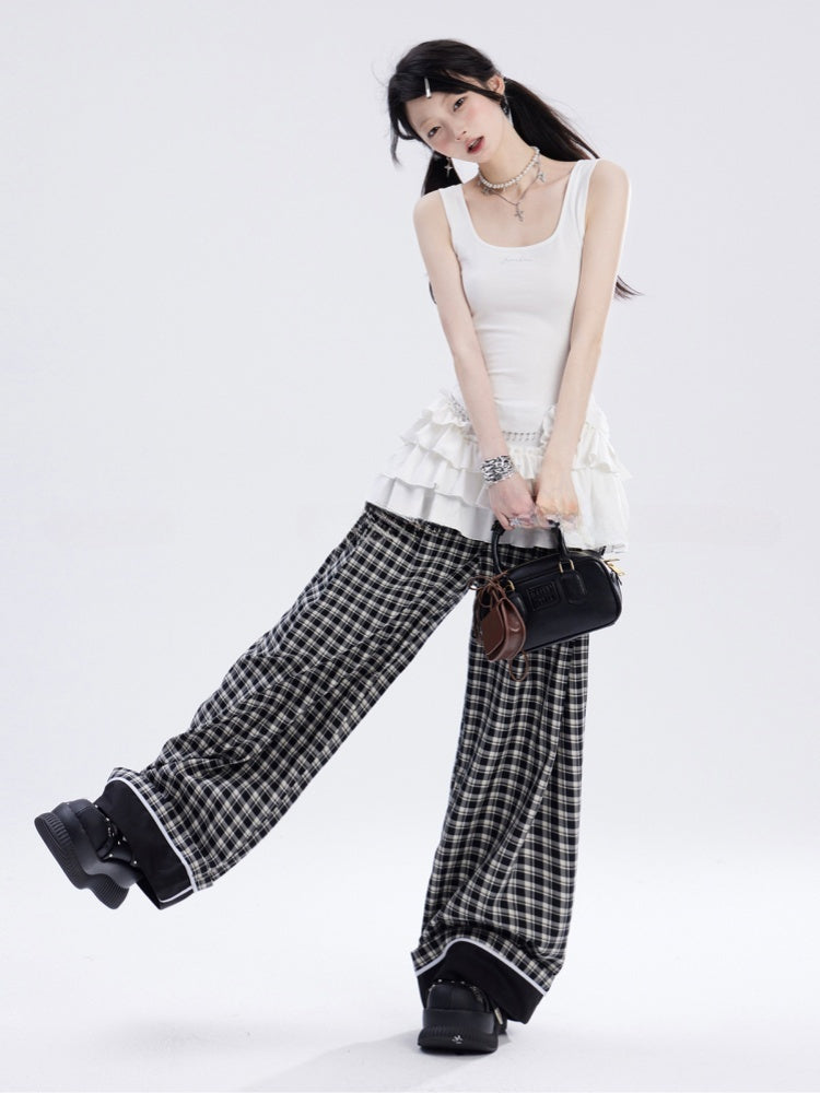 ブラックホワイトチェック柄ローウエストストレートレッグパンツ