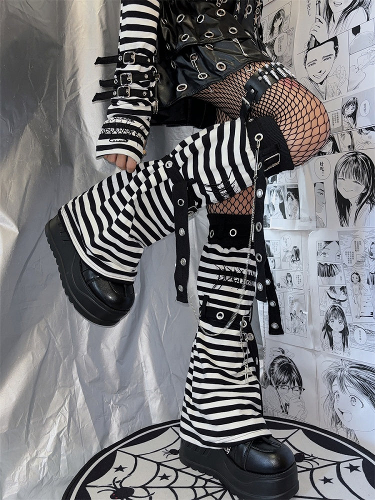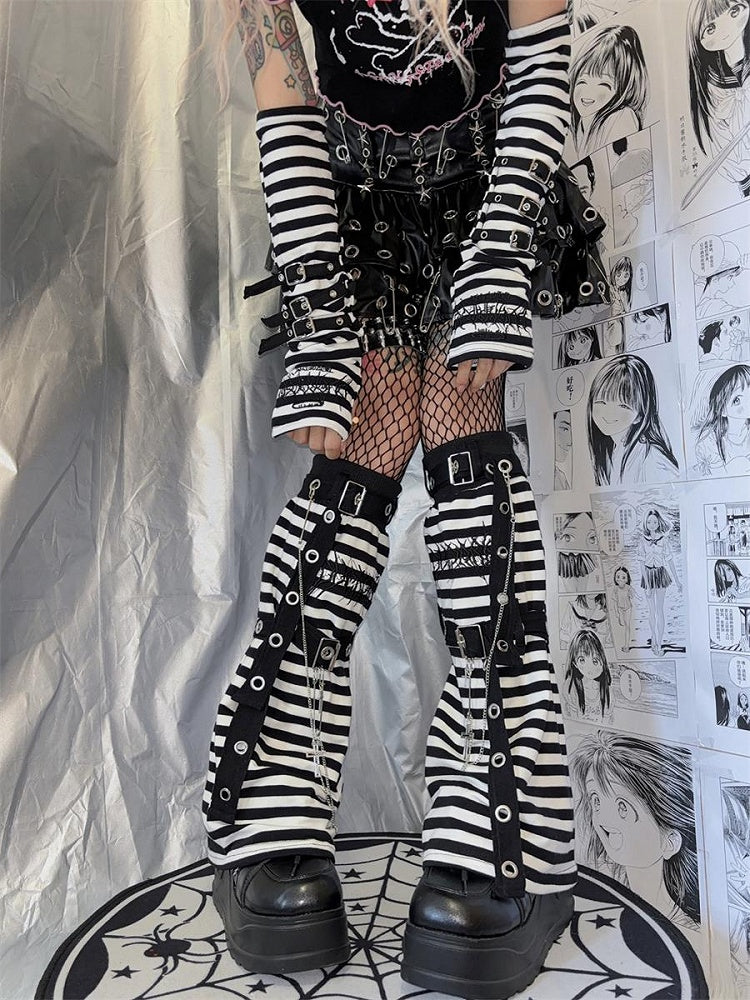 黒と白のストライプとクロスチェーンのパンクレッグウォーマー