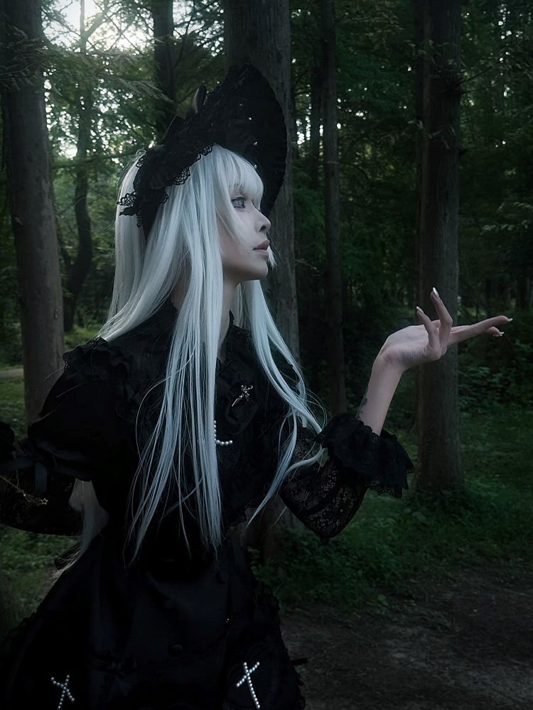 Black with Bead Bonnet Lace Lolita Accents Gothic