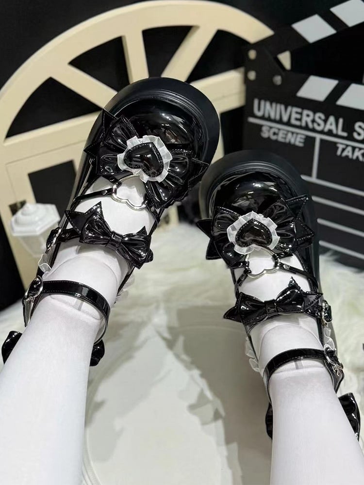 Black Sweet Lolita Platformss in PU Leather with Heart Embellishments, Lace Trim and Bow Decor