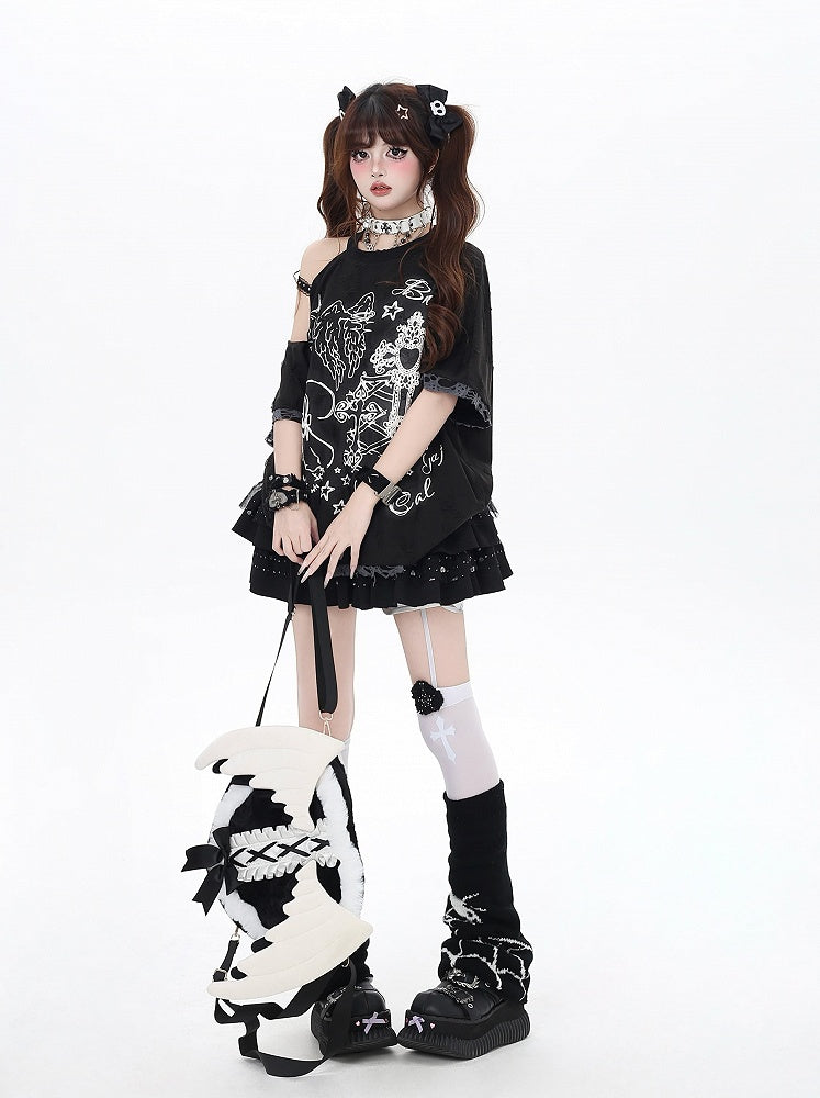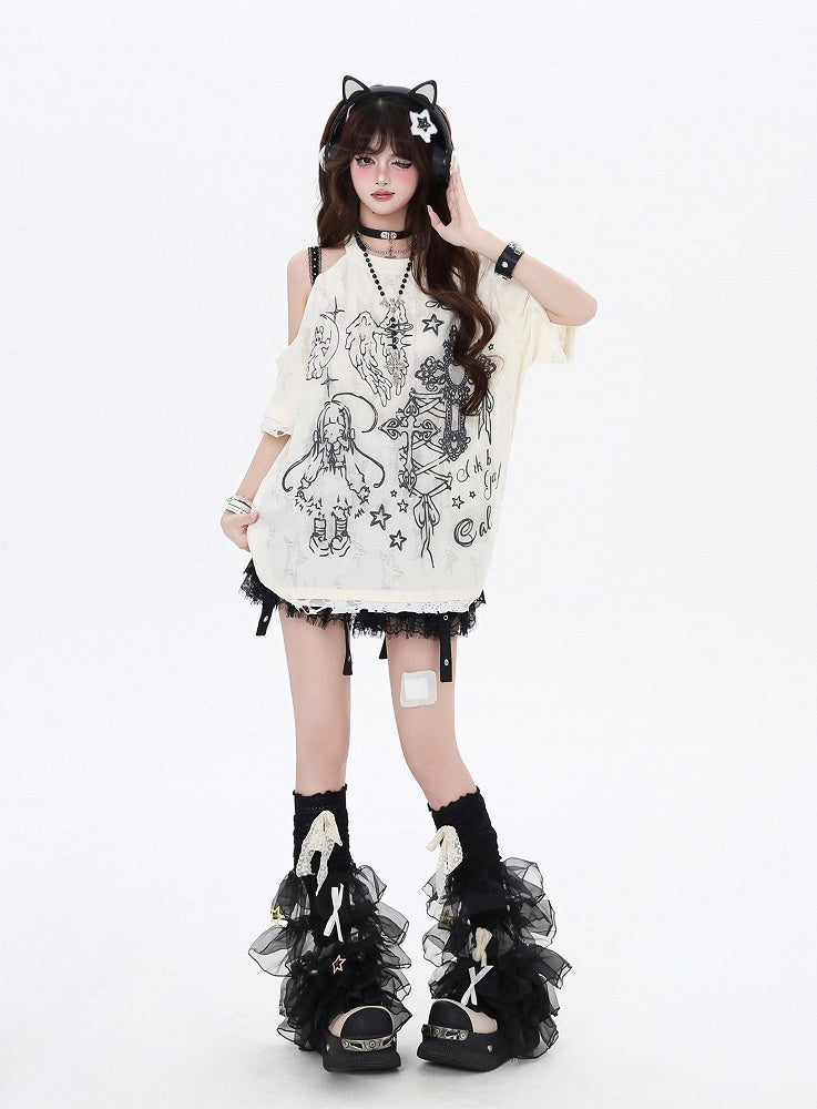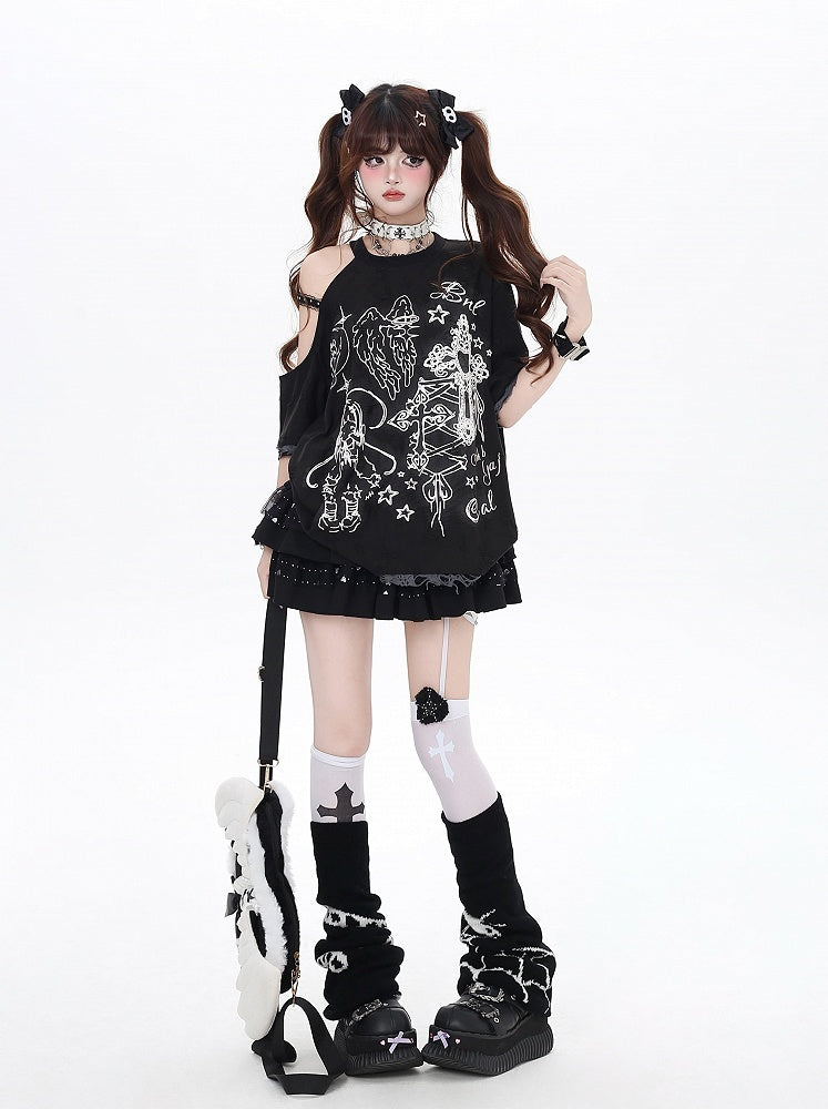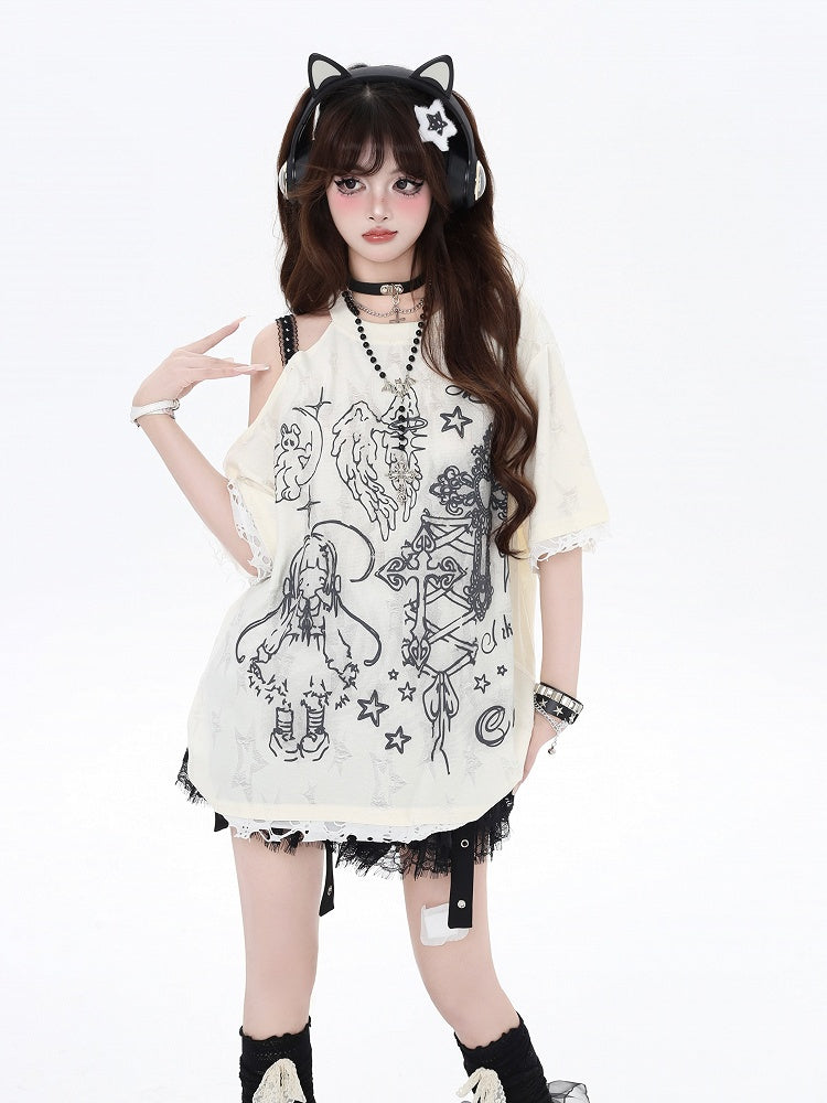 ラッキーエンジェル ブラック/ベージュ カットアウトショルダー グラフィティ ビタースウィート Tシャツ