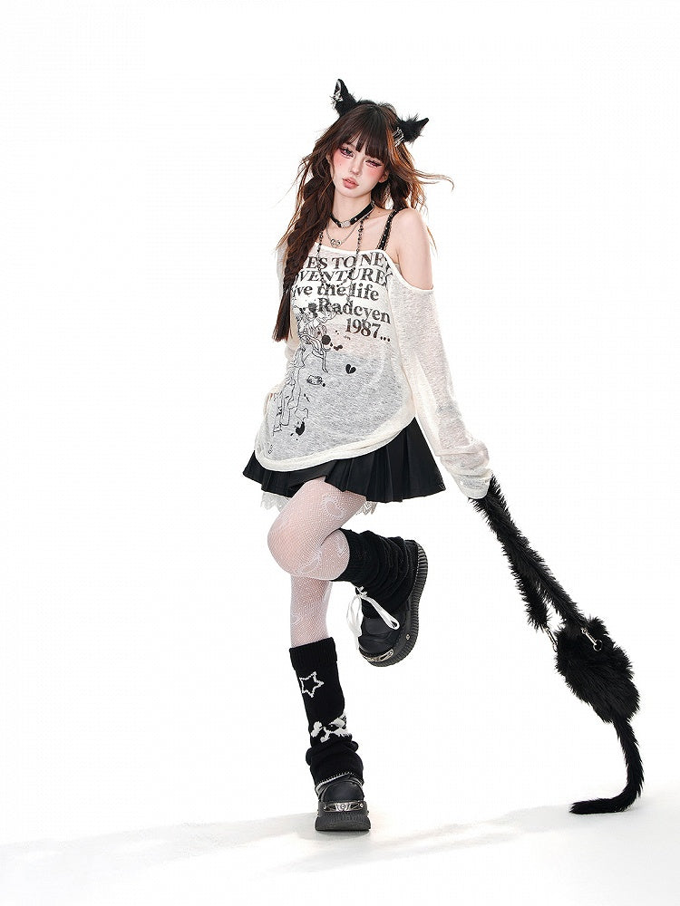 ブラック/ベージュのセミシースルーアシンメトリーネックラインカートゥーンプリントルーズトップス
