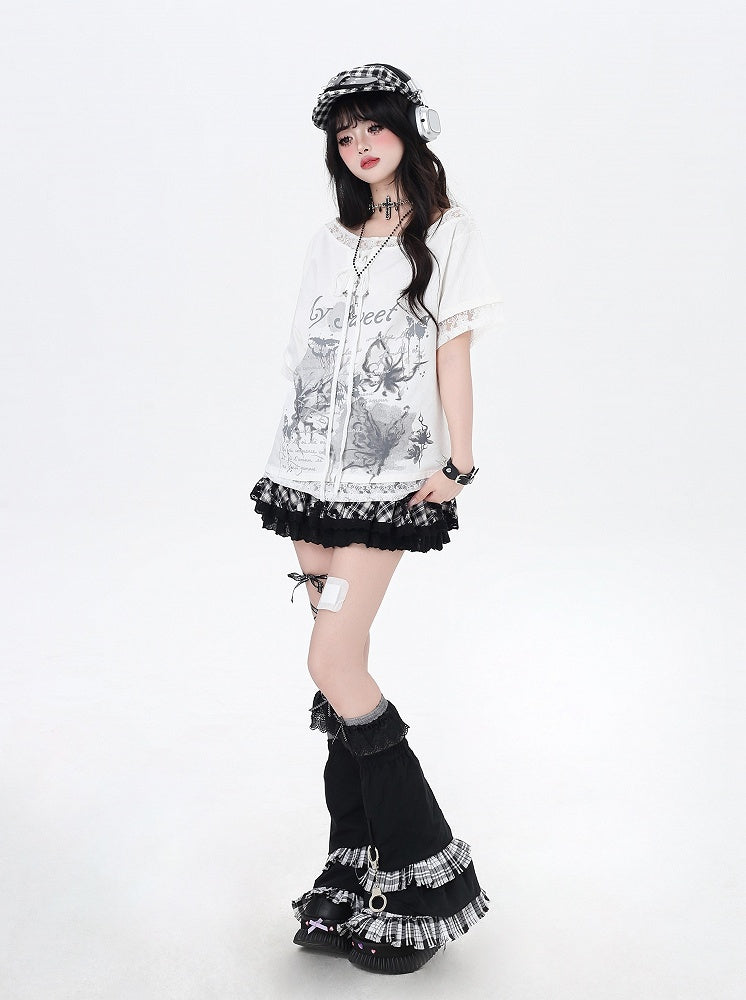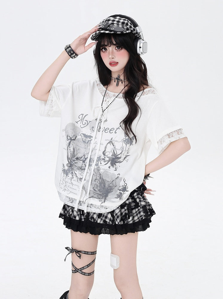 アシンメトリーなレースアップネックライン、レースパッチヘム、ブラック/ホワイトのグラフィックTシャツ