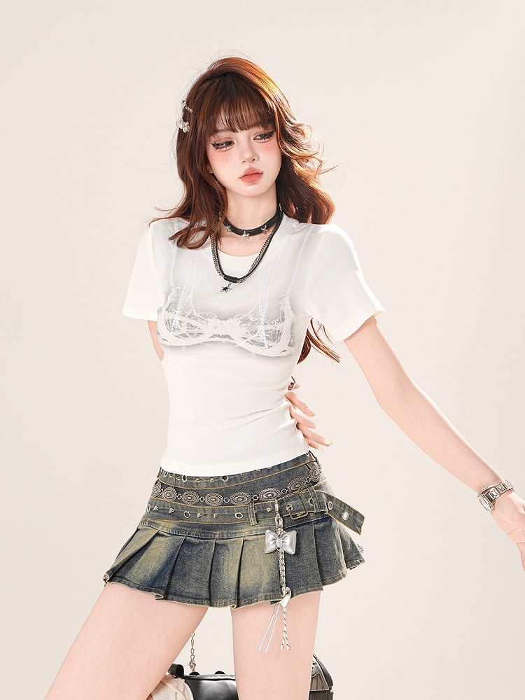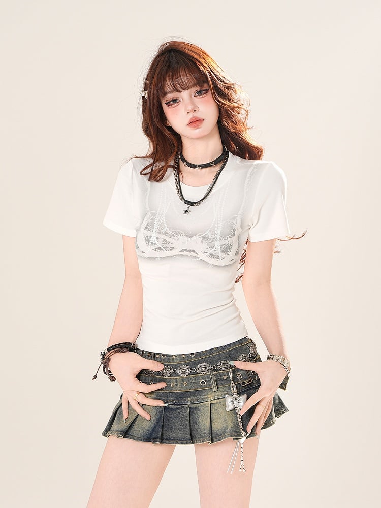 ブラック/ホワイト ラウンドネック キャミソールプリント スリムフィット Tシャツ