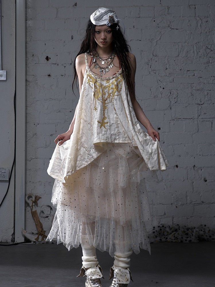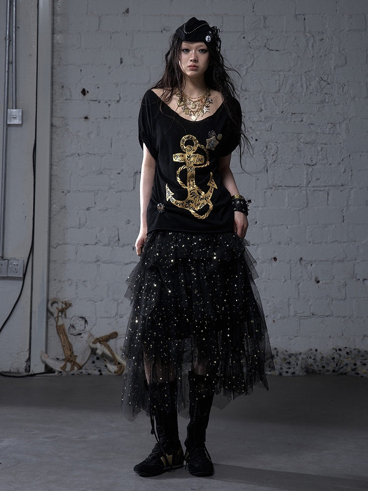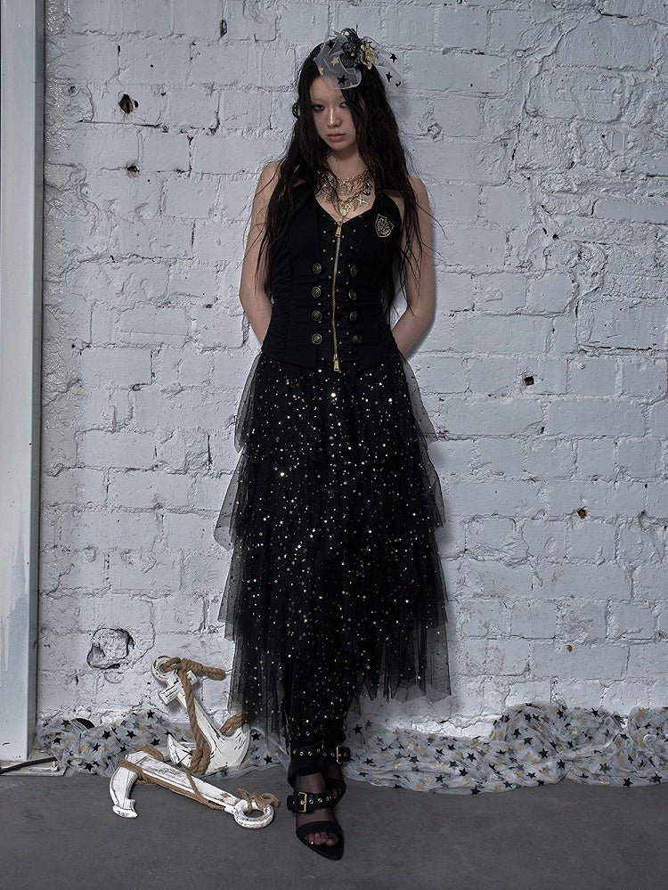 ブラック/ホワイト/アプリコット 伸縮性のあるウエスト スパンコールディテール ティアードメッシュスカート