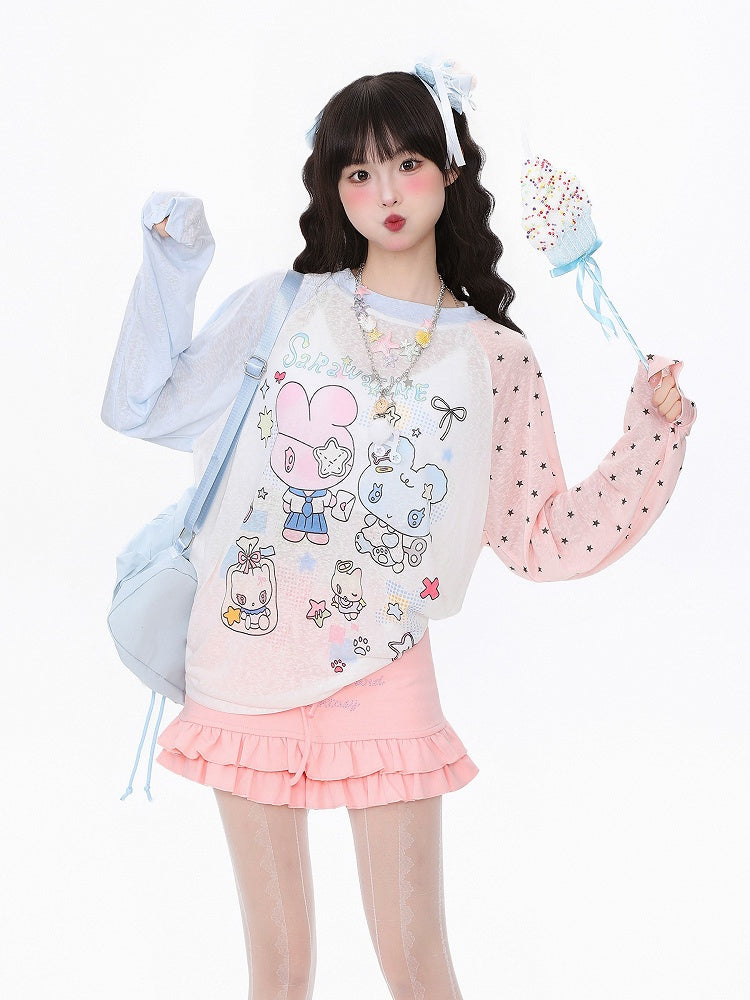 BlackWhite/PinkBlue Bunny Kitten Print Long Sleeve Top - Daily Kawaii Colorblock Design