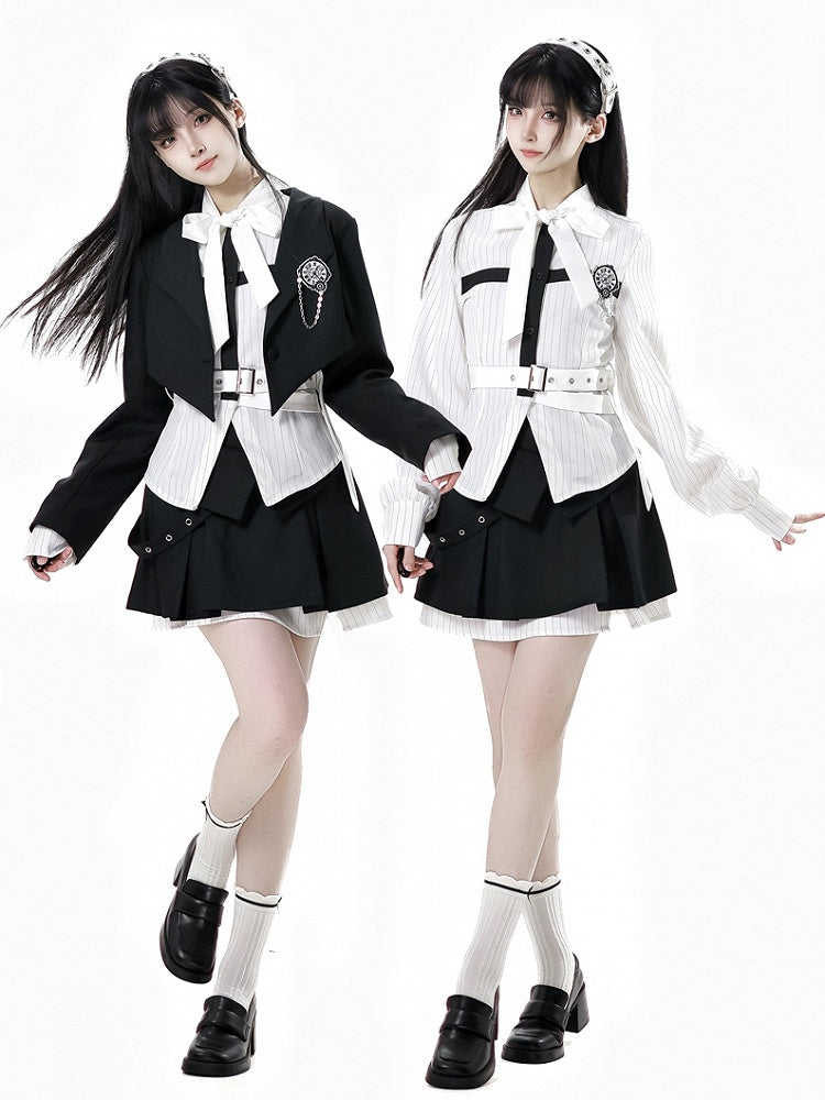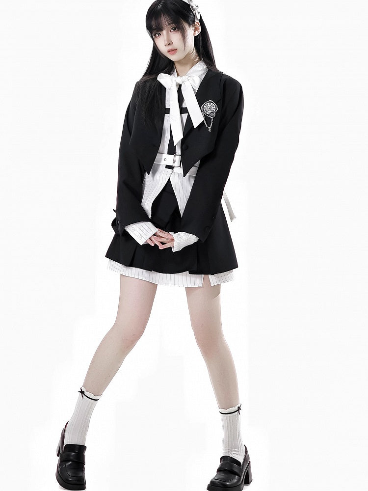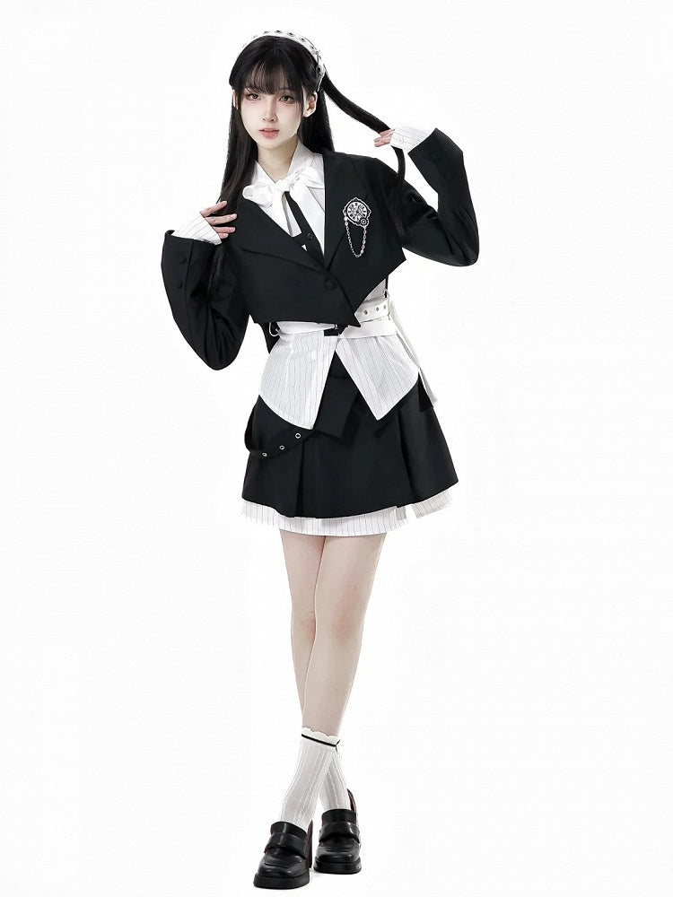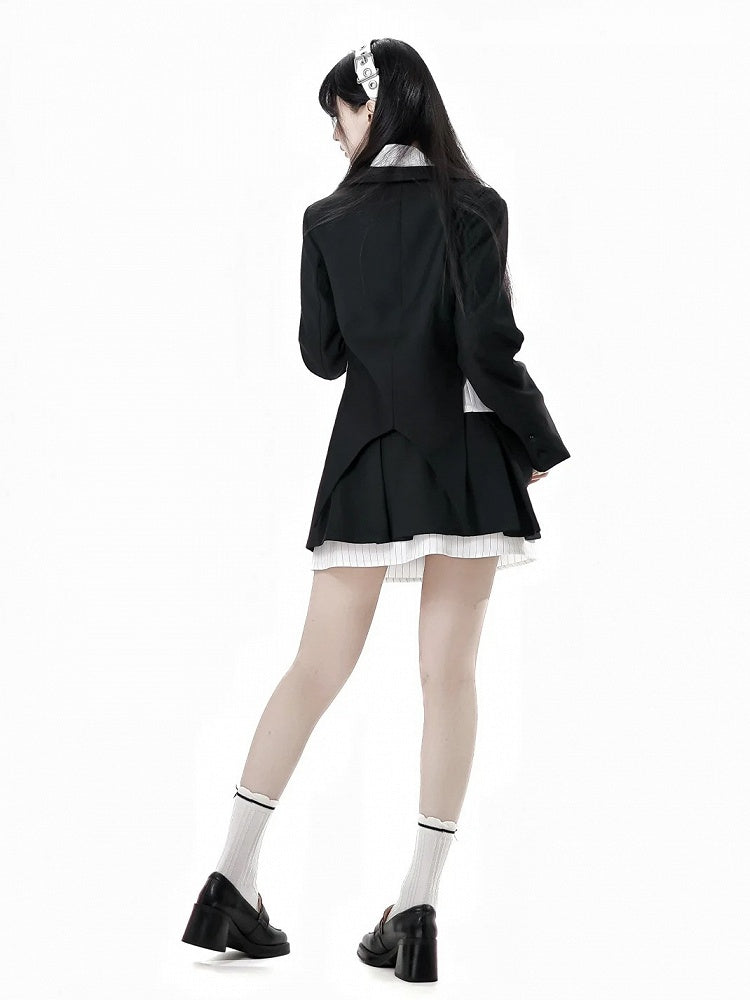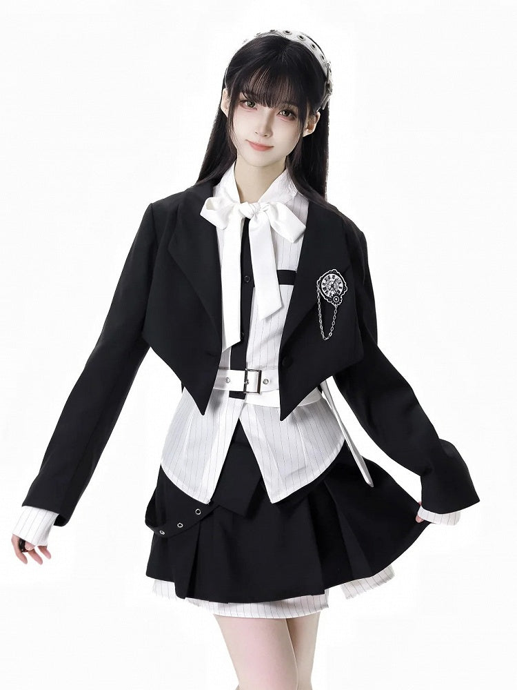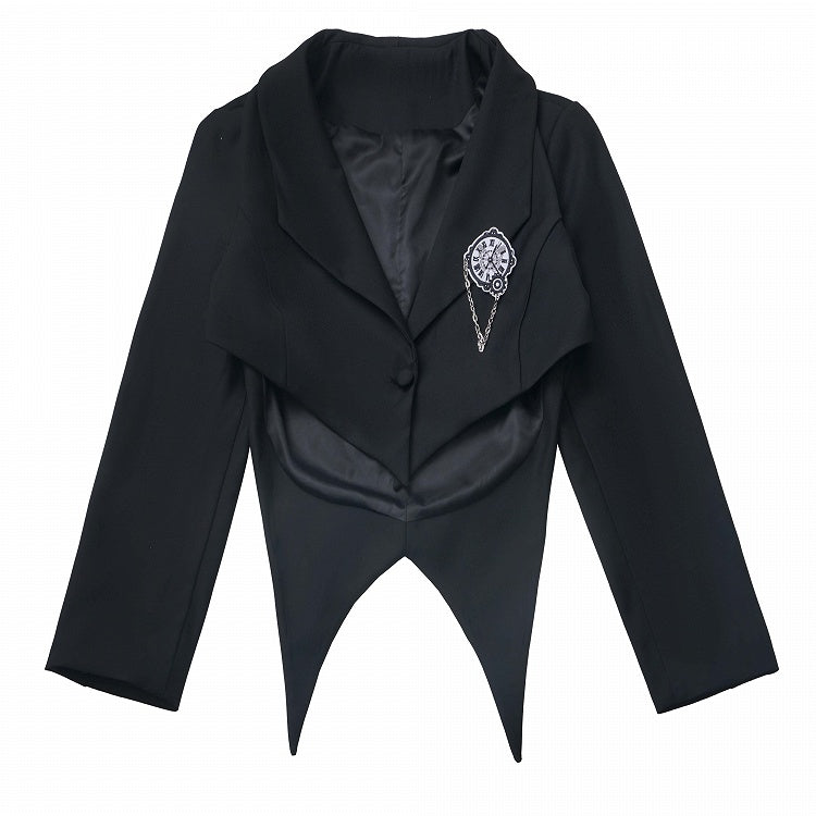 取り外し可能なバタフライクロックブローチ付きブレザー ブラック クロップド カーブヘム プレッピー