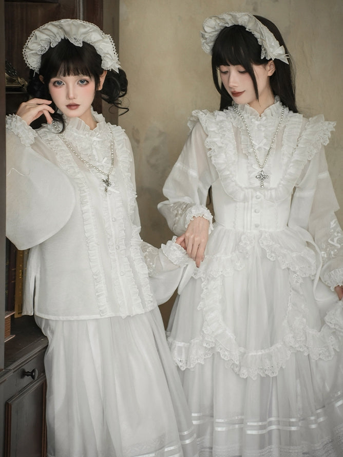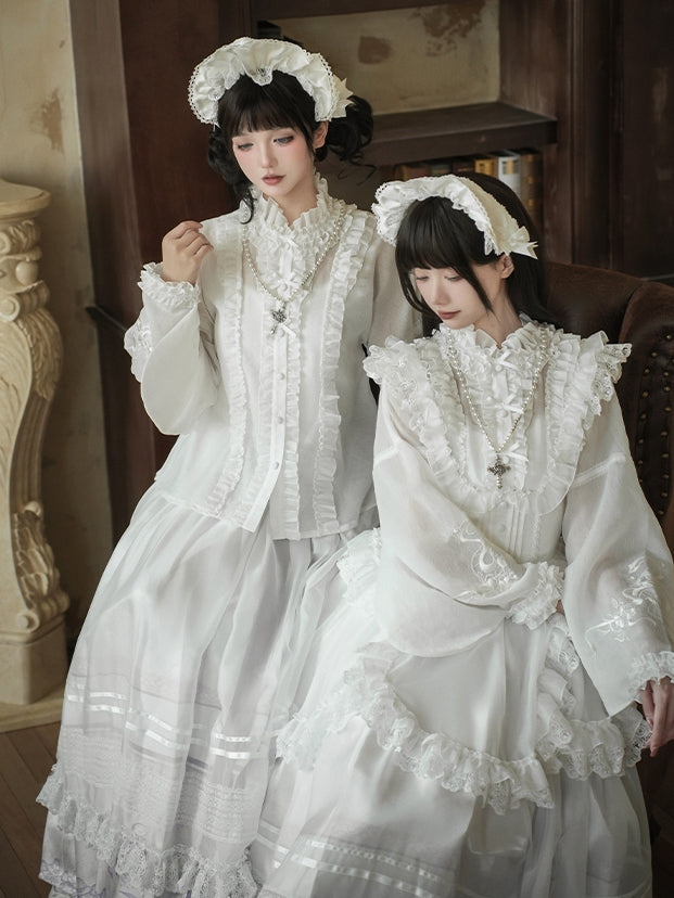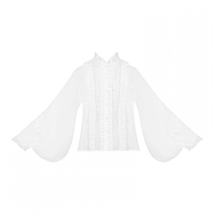 ホワイトのフリルネックライン、ヘビと花の刺繍入り長袖ハンロリータブラウス