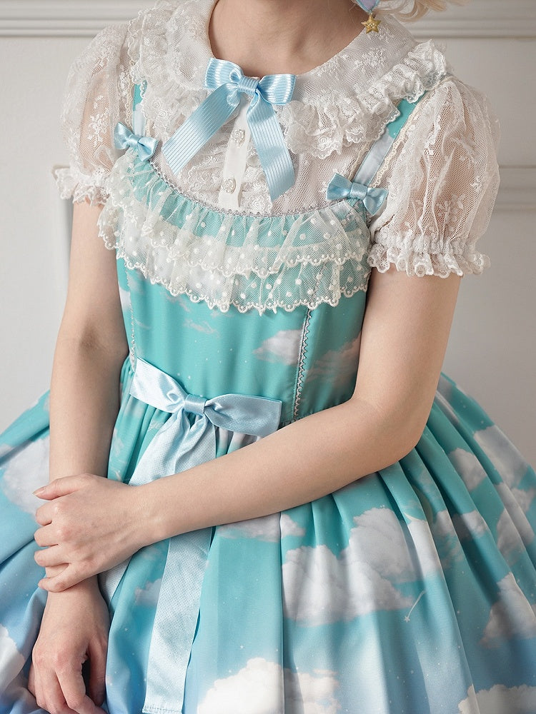 青と白のオールドスクールロリータファッションドレス 蝶結びディテール JSK セット