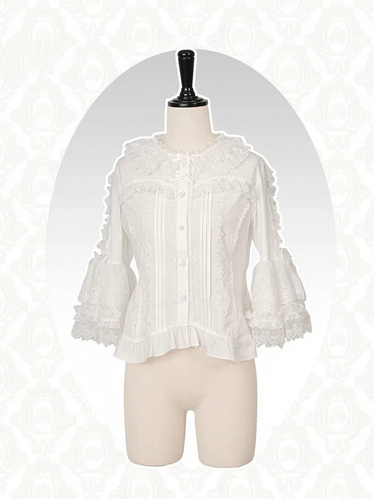 ホワイトのフリルネックライン7分袖ロリータブラウス