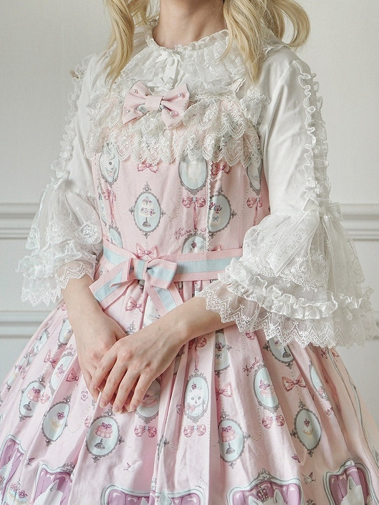 ピンクと白のオールドスクールロリータファッションドレス、蝶結びディテール、ロリータJSKセット