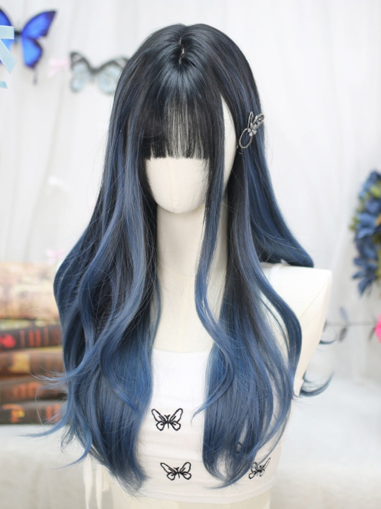 キュートなブルー&ブラックのハイライト入りアンダーバスト丈ウェーブウィッグ(エアバング付き)で、周りの視線を釘付けにしませんか?ウェーブの質感が遊び心をプラスし、エアバングがお顔を美しく縁取ります。軽やかで楽しい雰囲気にぴったりです!