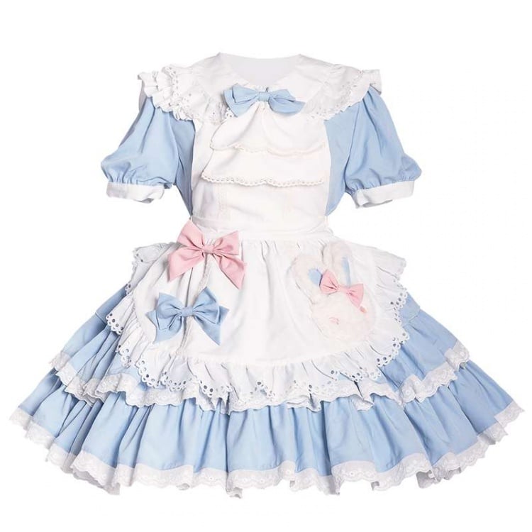青と白のバニーテーマのティアードフリルメイドロリータドレス