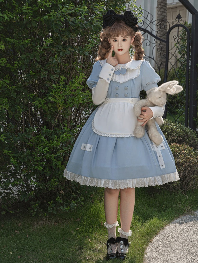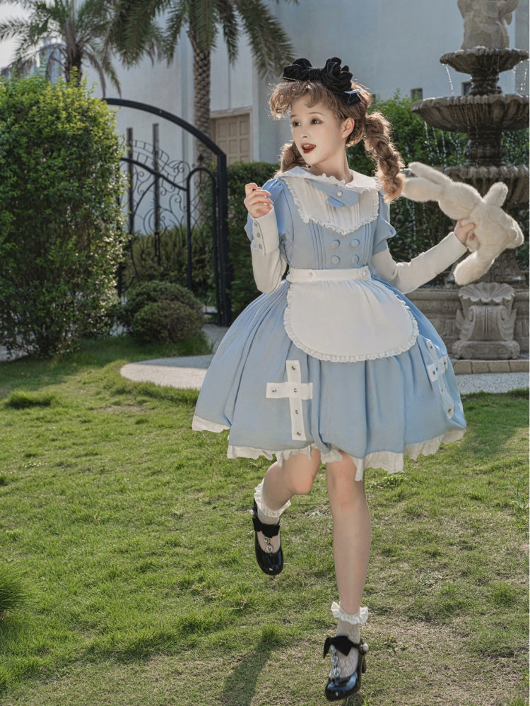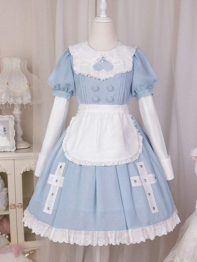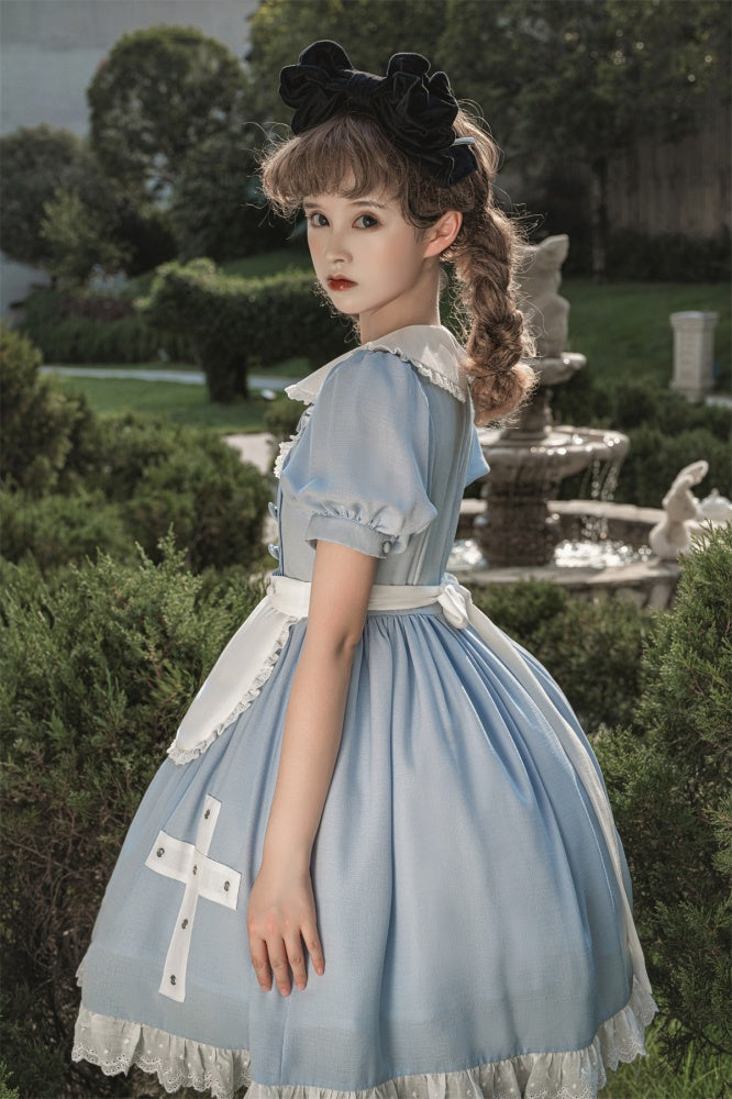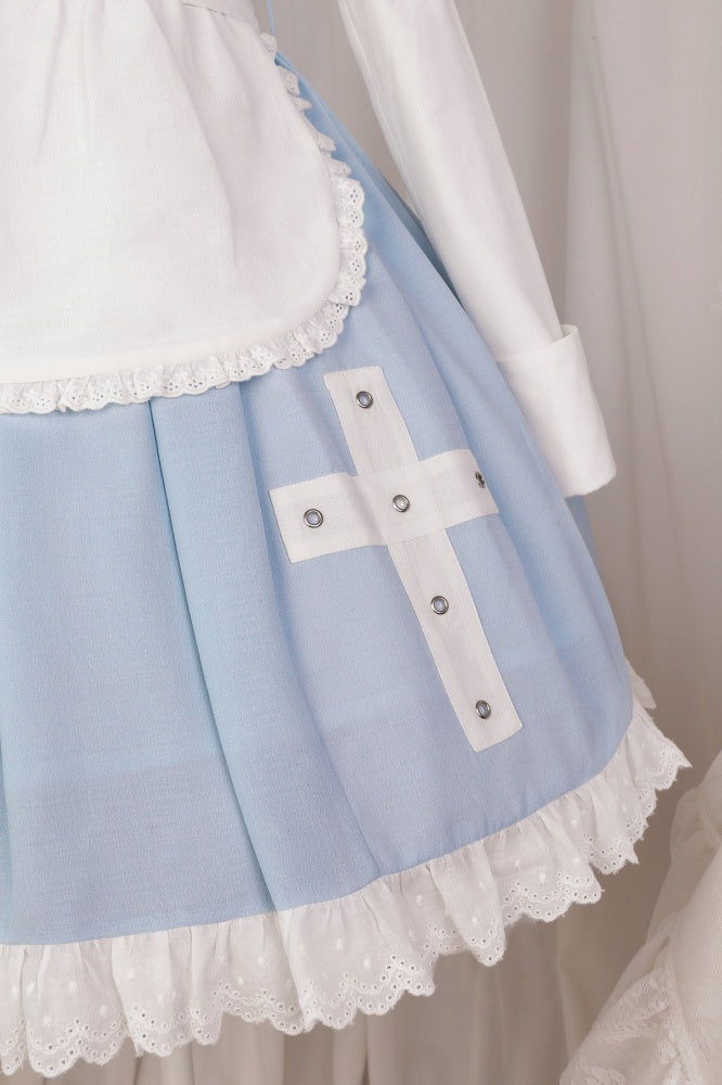 青と白のオールドスクールロリータファッションドレス 蝶結びディテール JSK セット