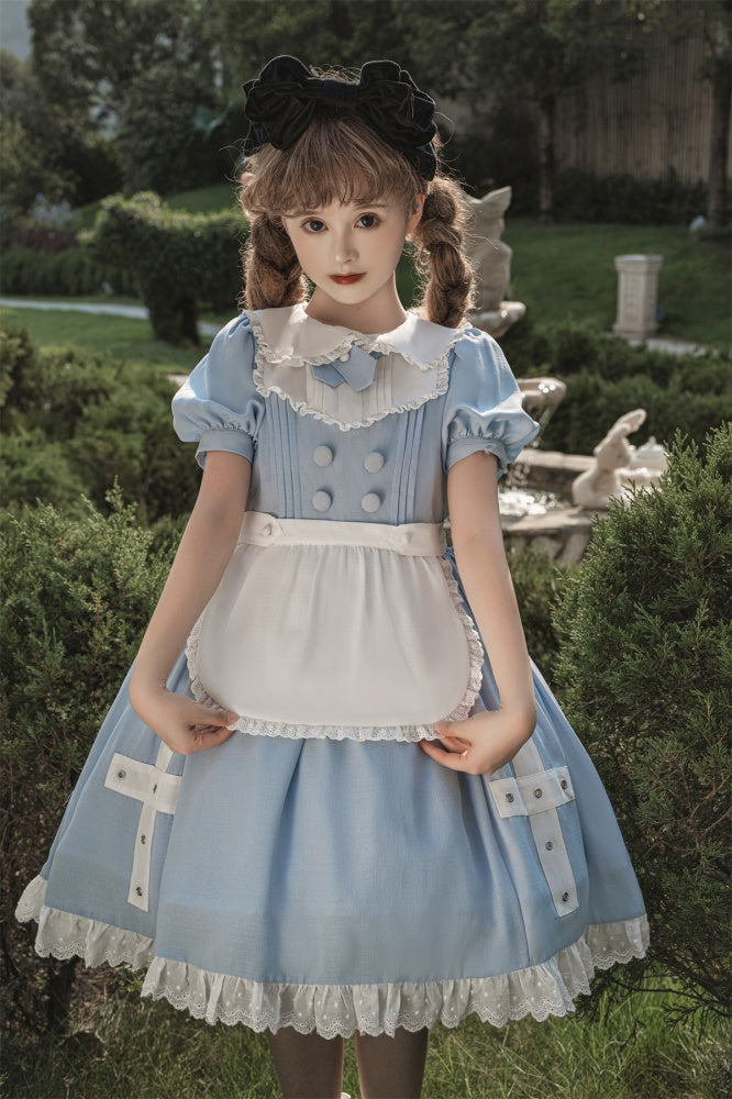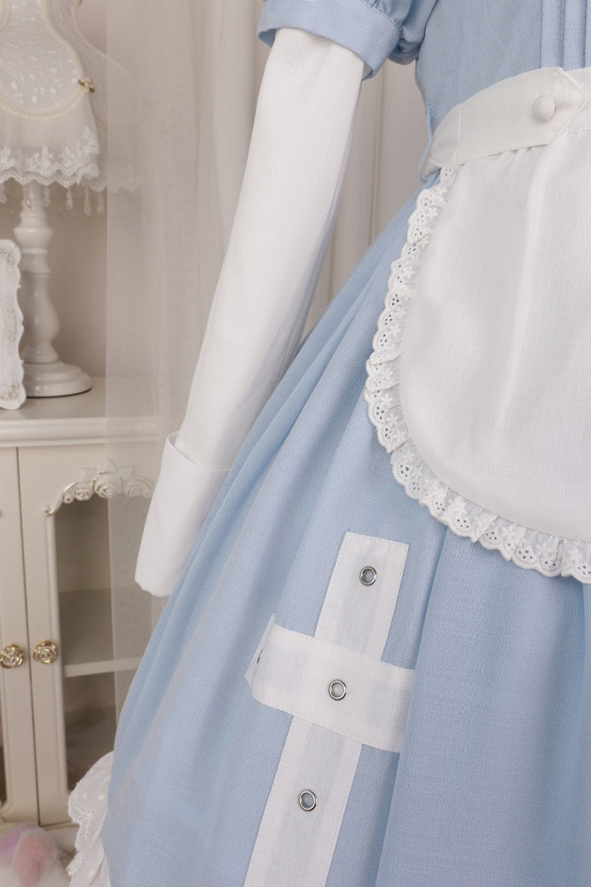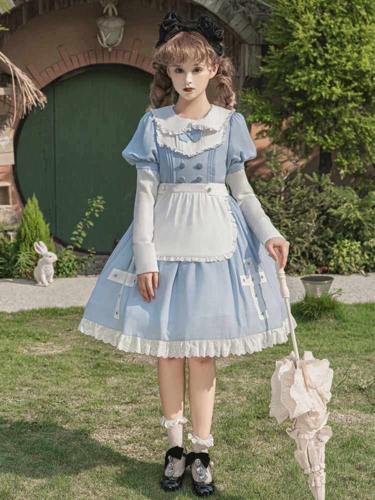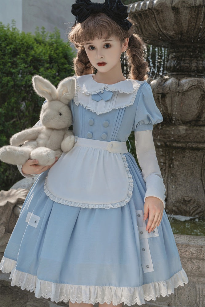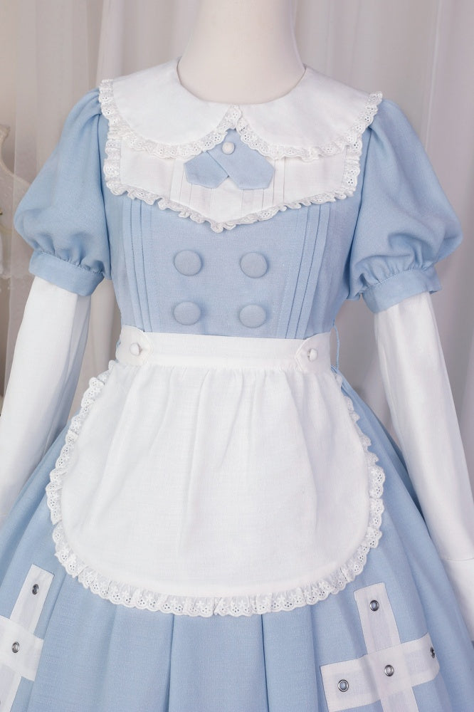 青と白のオールドスクールロリータファッションドレス 蝶結びディテール JSK セット
