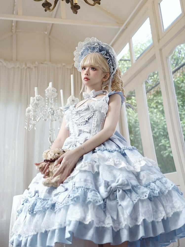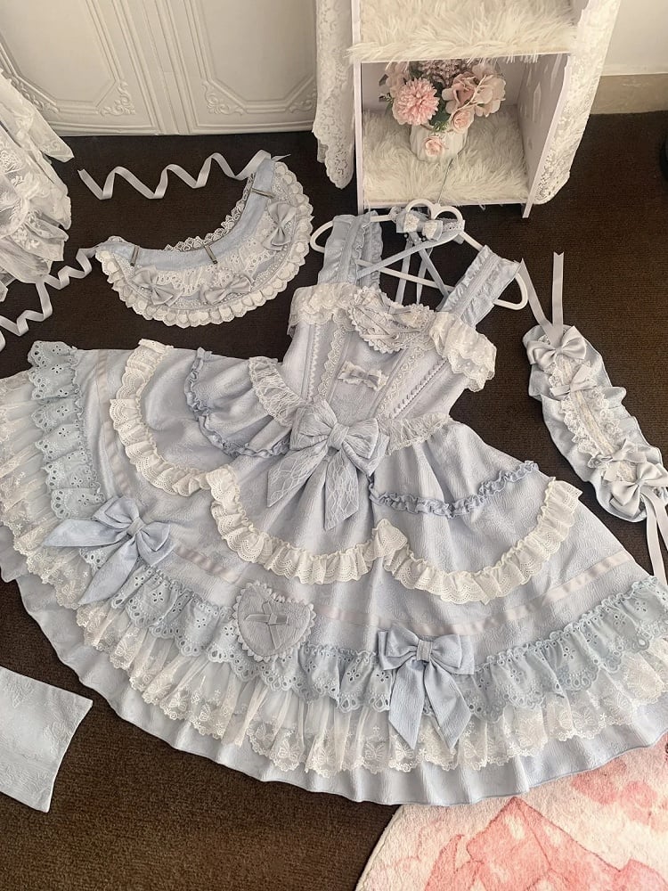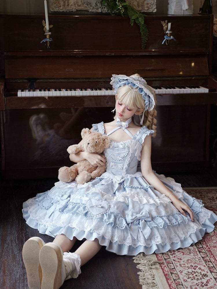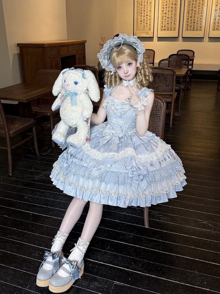 青と白のオールドスクールロリータドレス、リボンとハート型の装飾、プリンセスロリータジャンパースカート