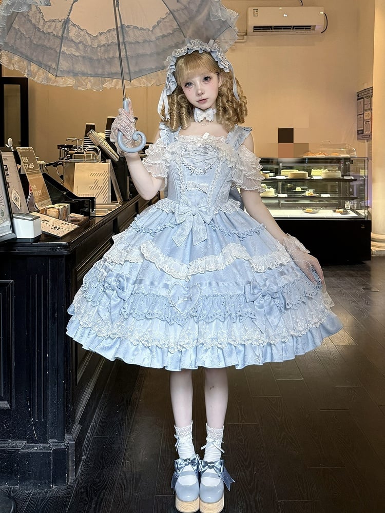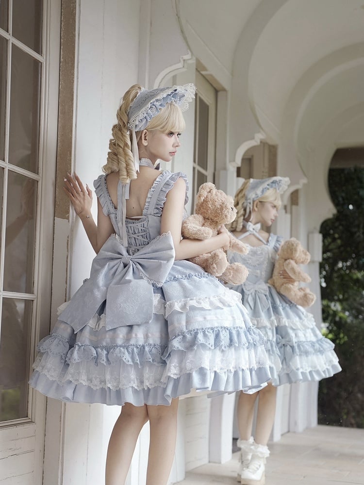 青と白のオールドスクールロリータファッションドレス 蝶結びディテール JSK セット