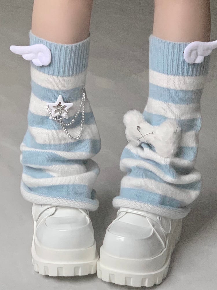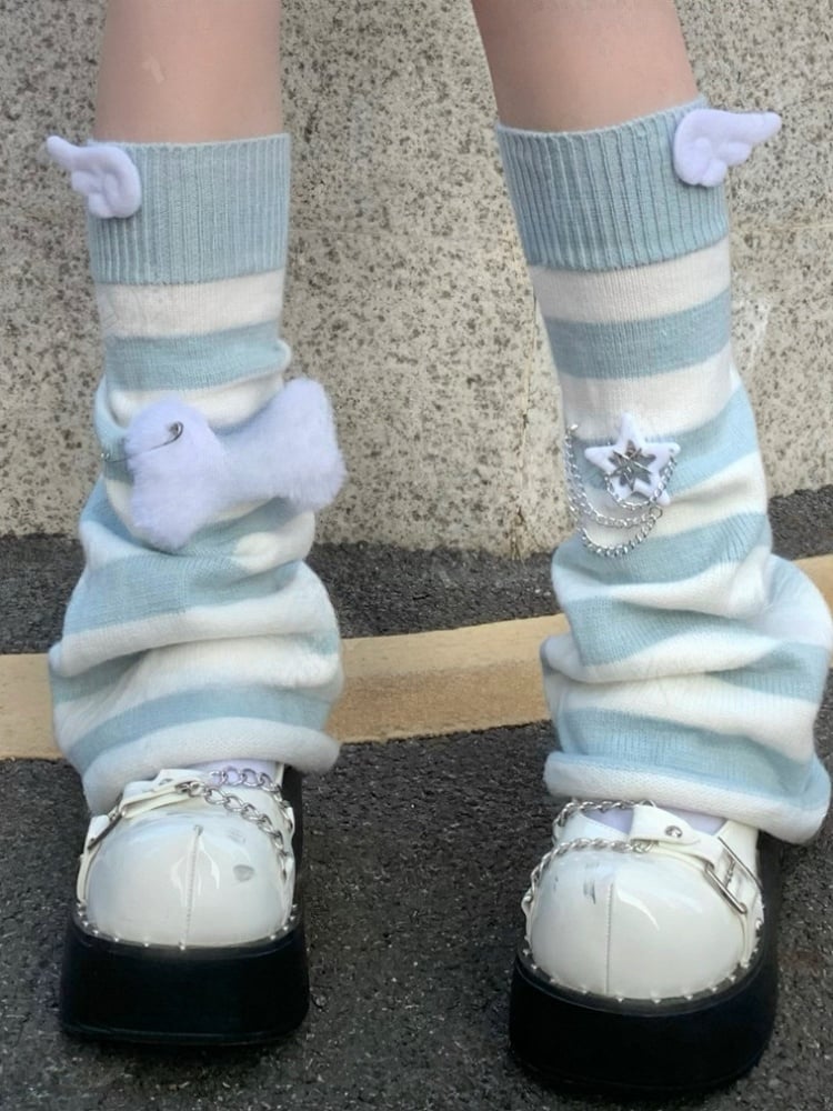 愛らしいブルー/ブラックのストライプ柄ウィングレッグウォーマー。ボーンプラッシュが付属し、どんなコーディネートにもチャーミングなアクセントを添えます。足を暖かく心地よく包み込みながら、キュートなスタイルを演出します。快適さと可愛らしさの両方を求めるファッショナブルな方にぴったりです。