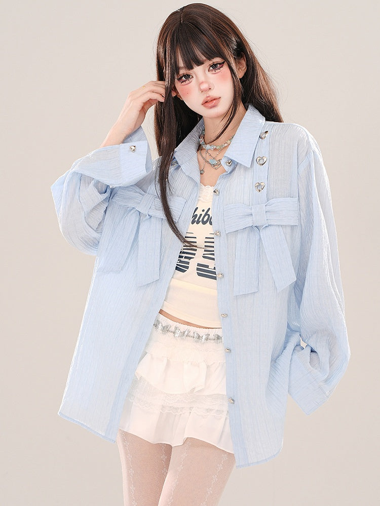 ブルーのリボンディテールが映えるルーズシャツで、スタイリッシュに着こなしましょう。愛らしいリボンがコーディネートにキュートなアクセントを添えます。ゆったりとしたフィット感で着心地も良く、シックな印象も叶えます。どんなシーンにもぴったりです!