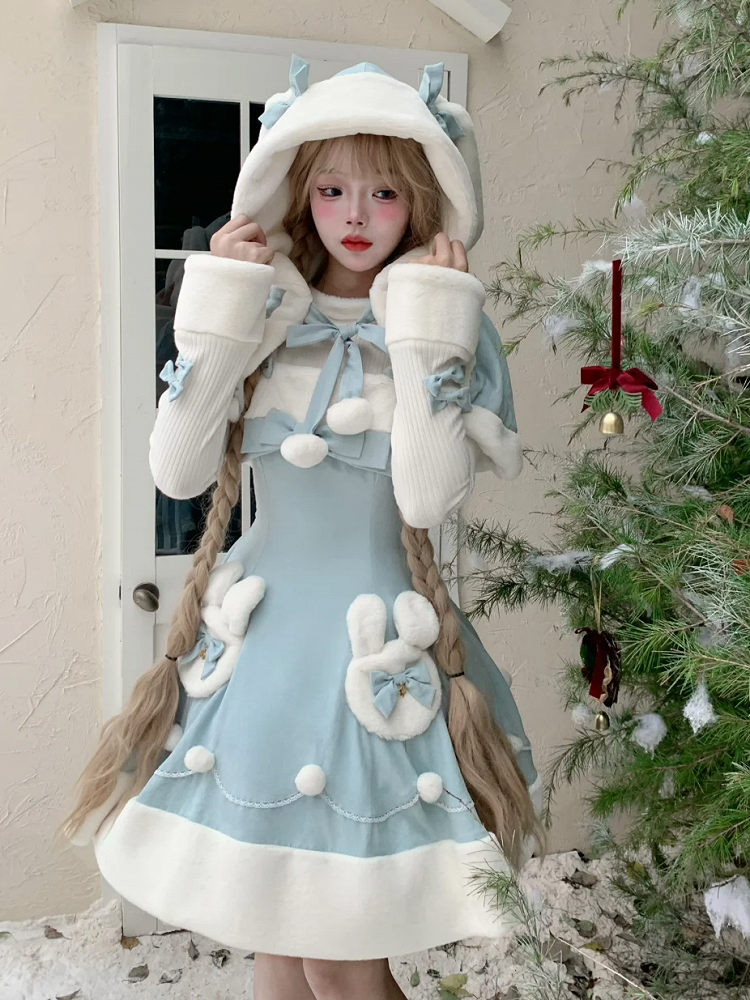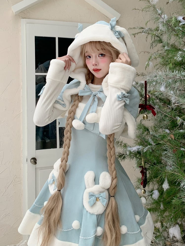青と白のオールドスクールロリータファッションドレス 蝶結びディテール JSK セット