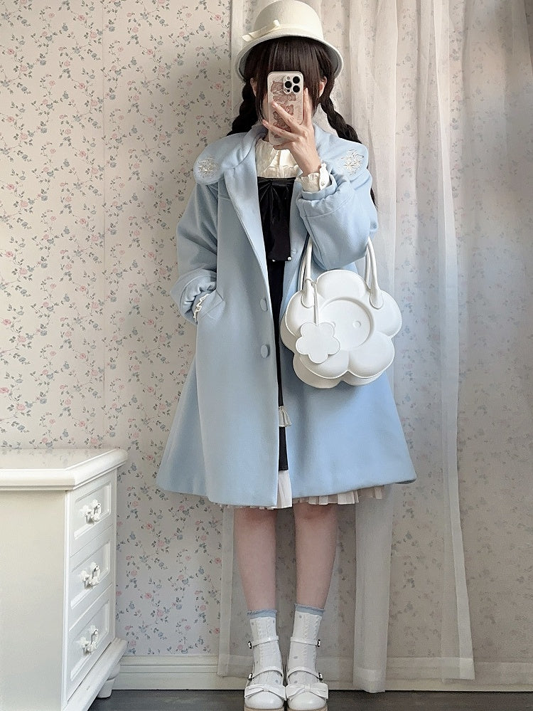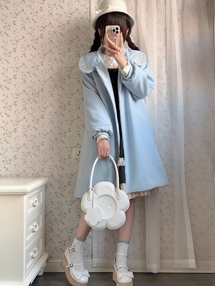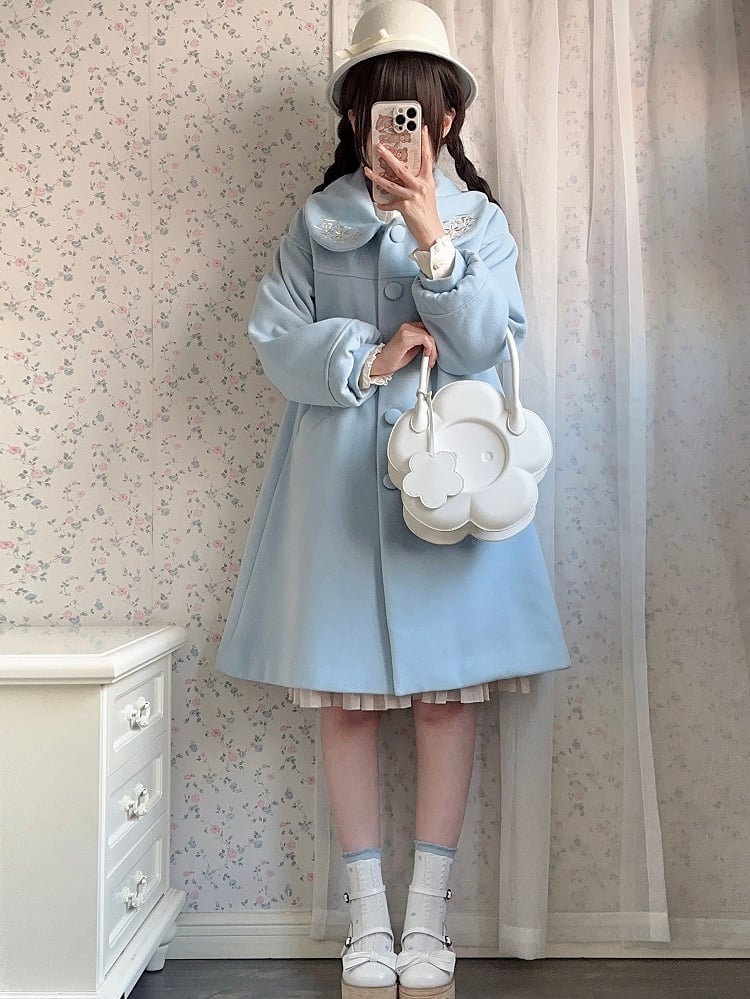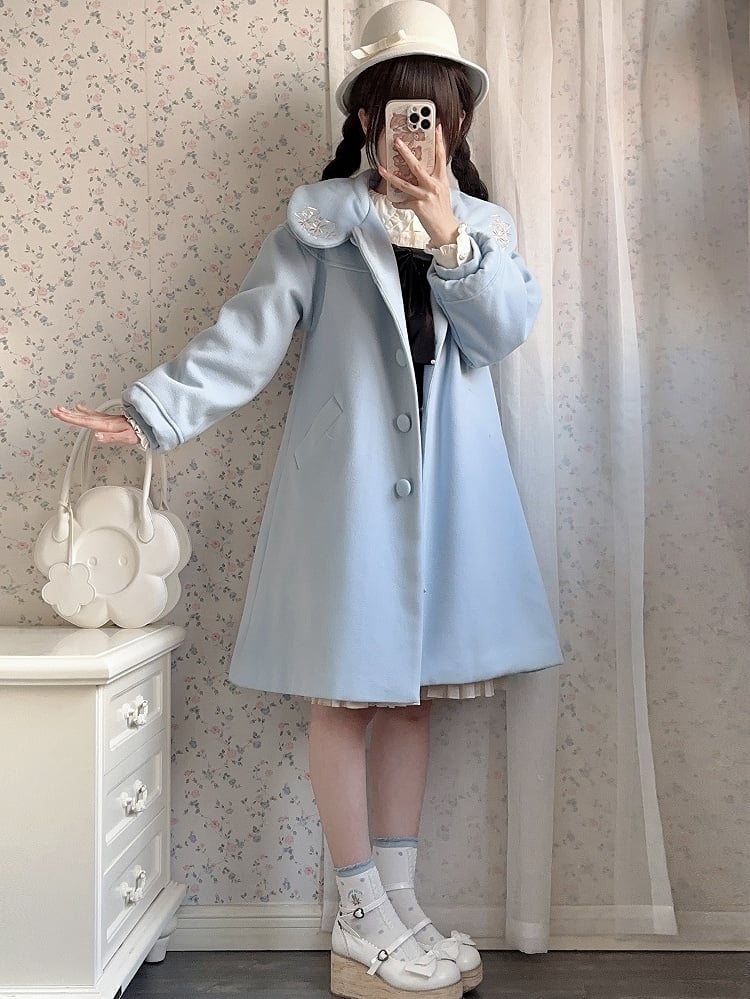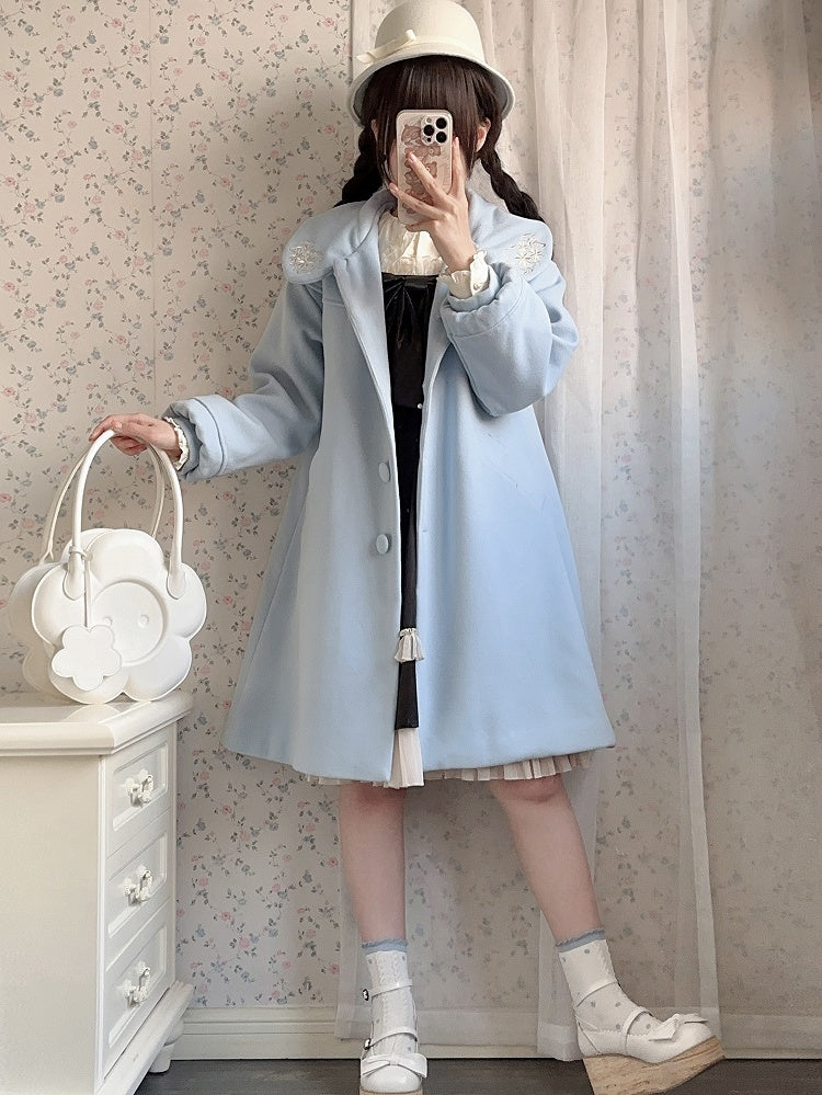 ブルーの繊細な花柄ラウンドフラットカラーウールコート