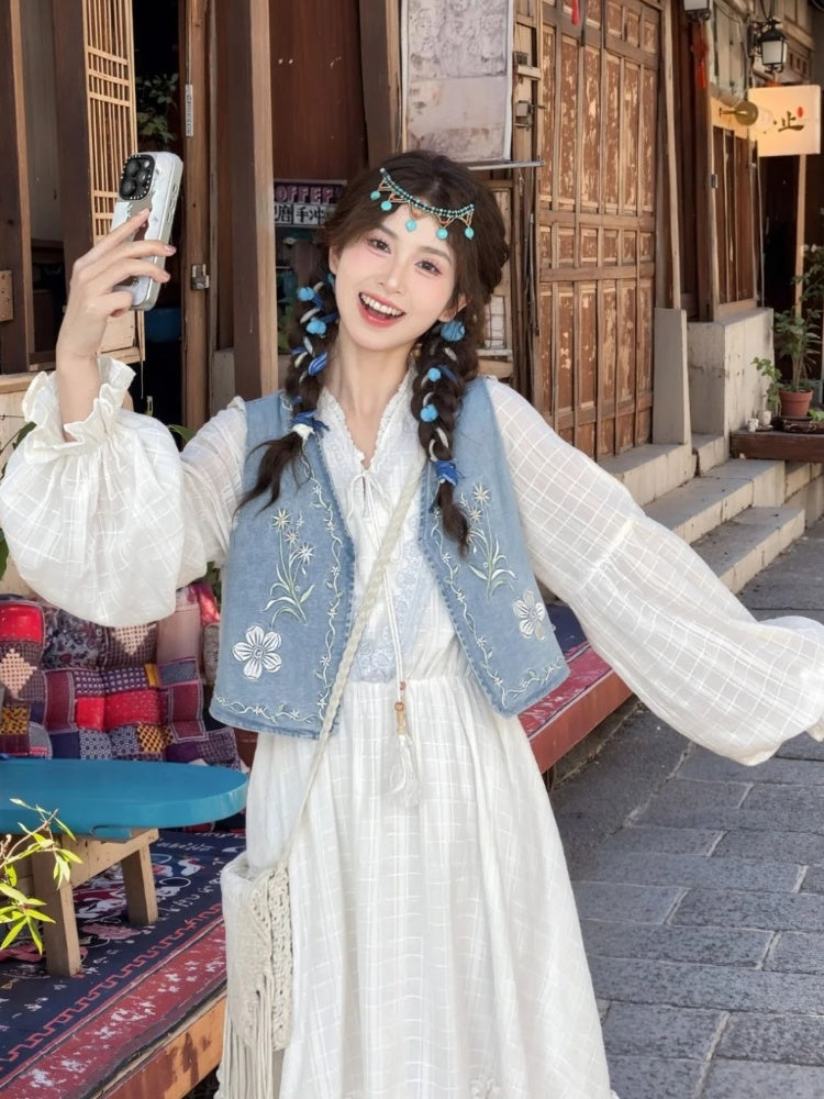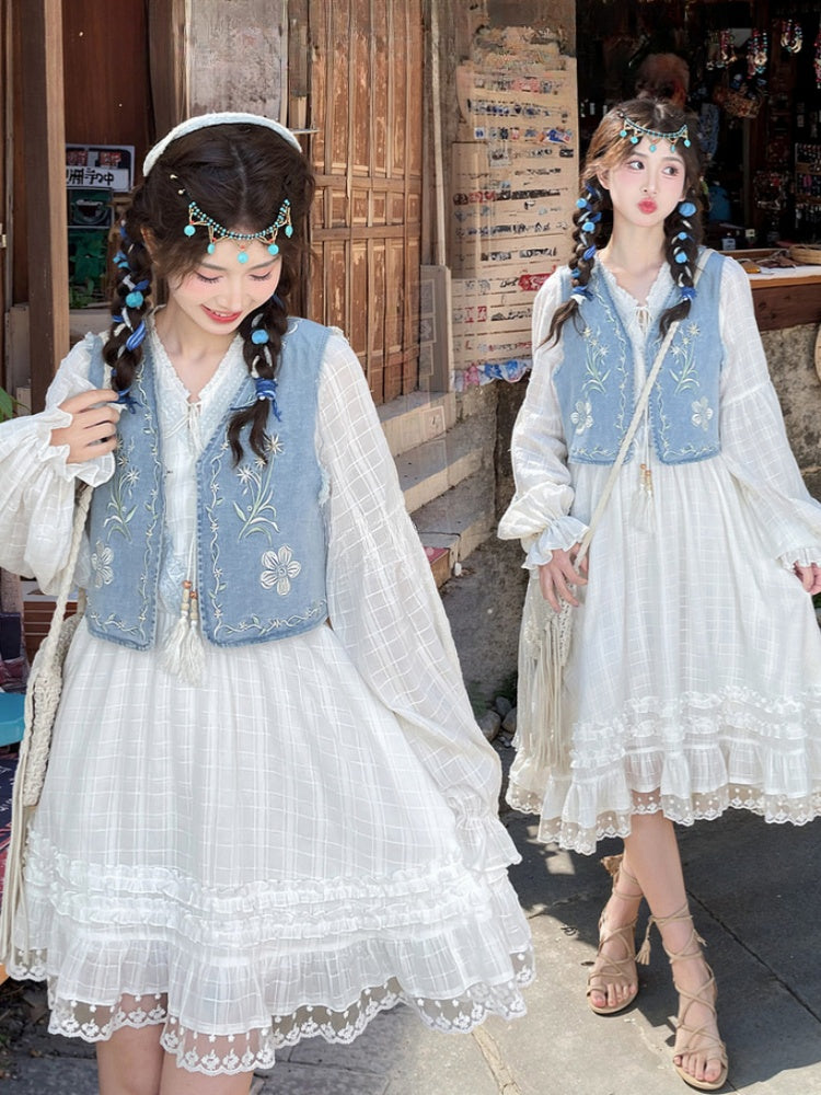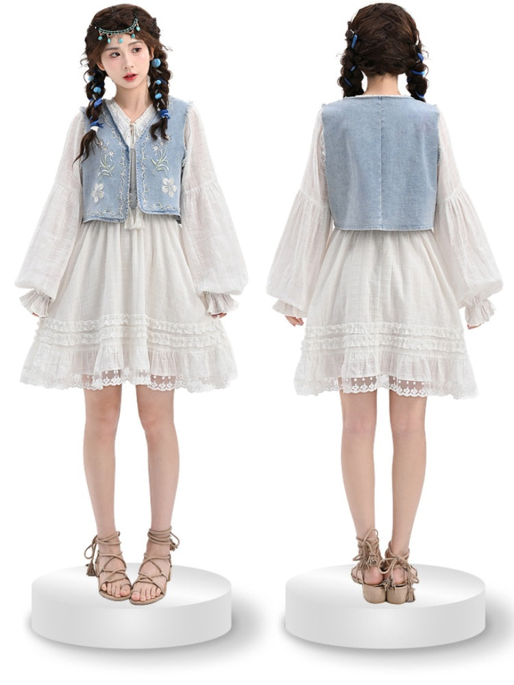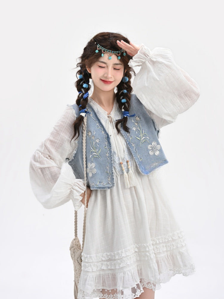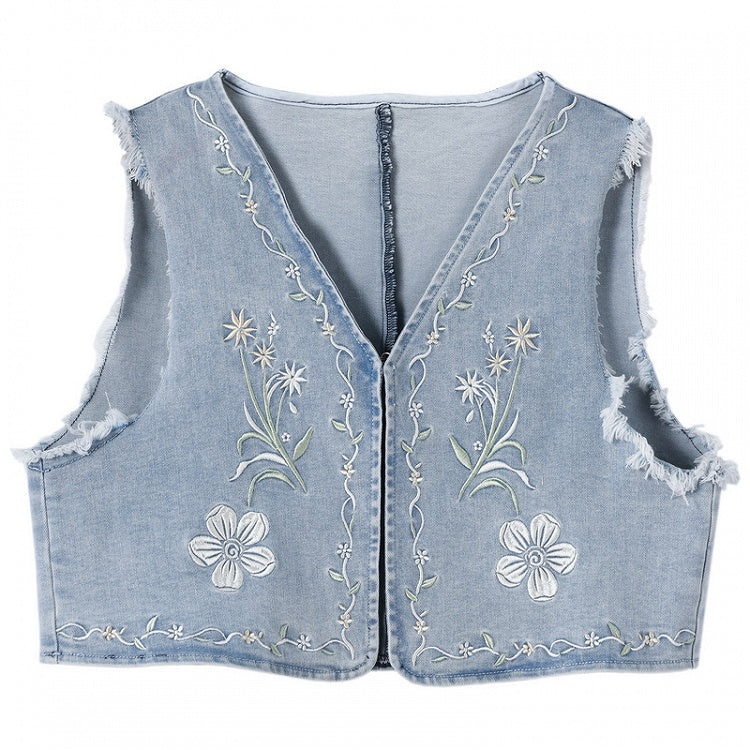 花柄刺繍、フェードウォッシュ加工、ダメージ加工のブルーデニムベスト