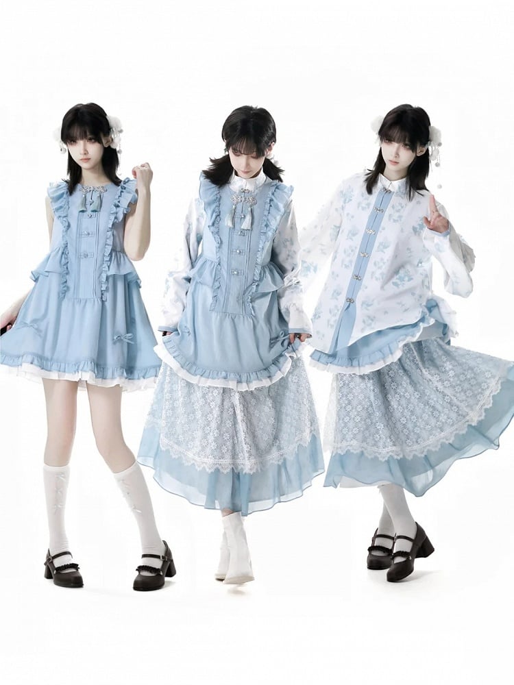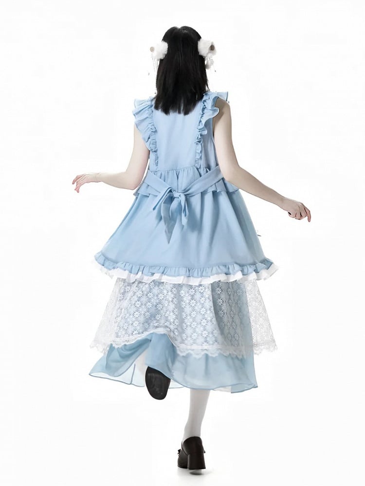 青と白のオールドスクールロリータファッションドレス 蝶結びディテール JSK セット