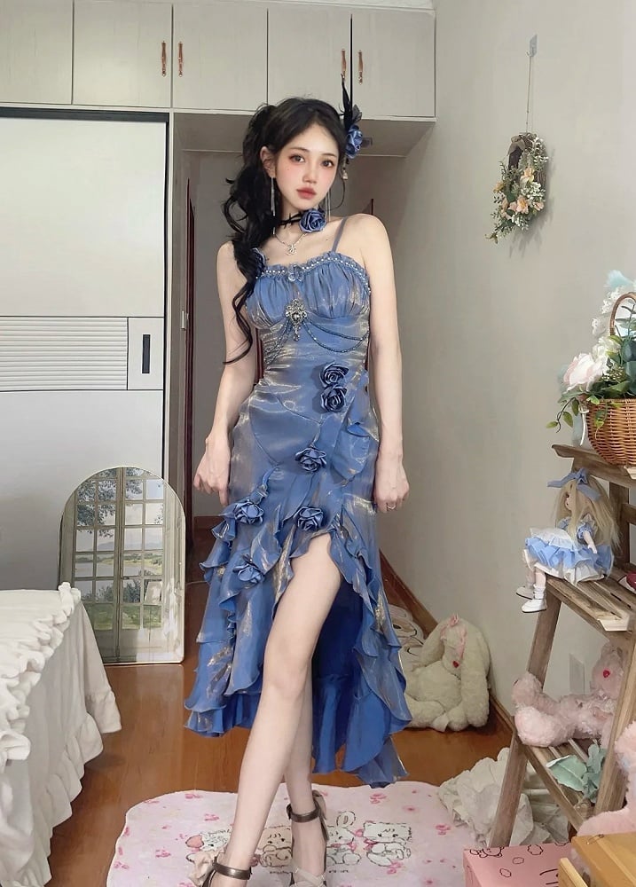 この美しくエレガントなブルーのイブニングドレス、ロゼットマーメイドドレスは、取り外し可能なフリルスリーブが特徴で、より控えめな印象に。ロゼットのディテールがロマンチックな雰囲気を添え、あらゆるフォーマルなイベントに最適です。