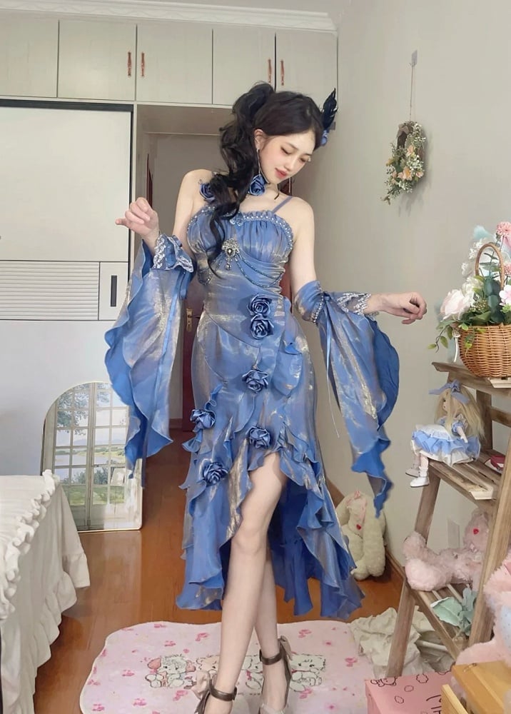 取り外し可能なフリル袖付きブルーのイブニングドレス、ロゼットマーメイドドレス