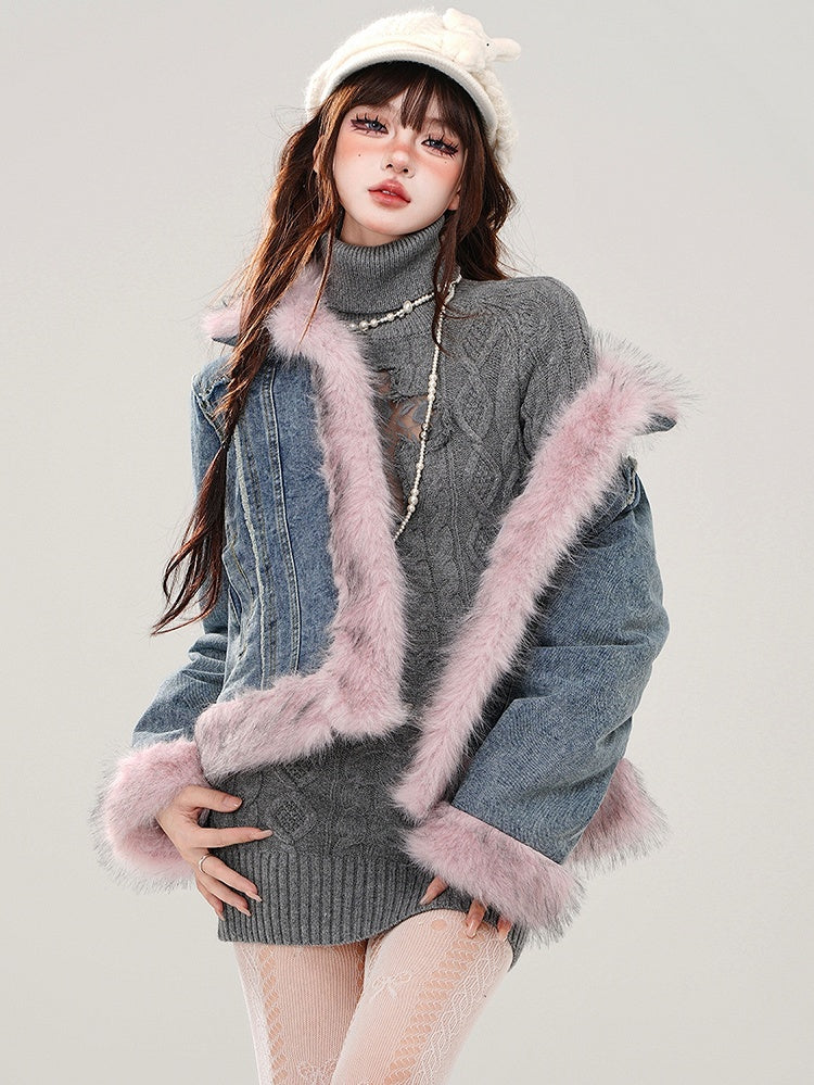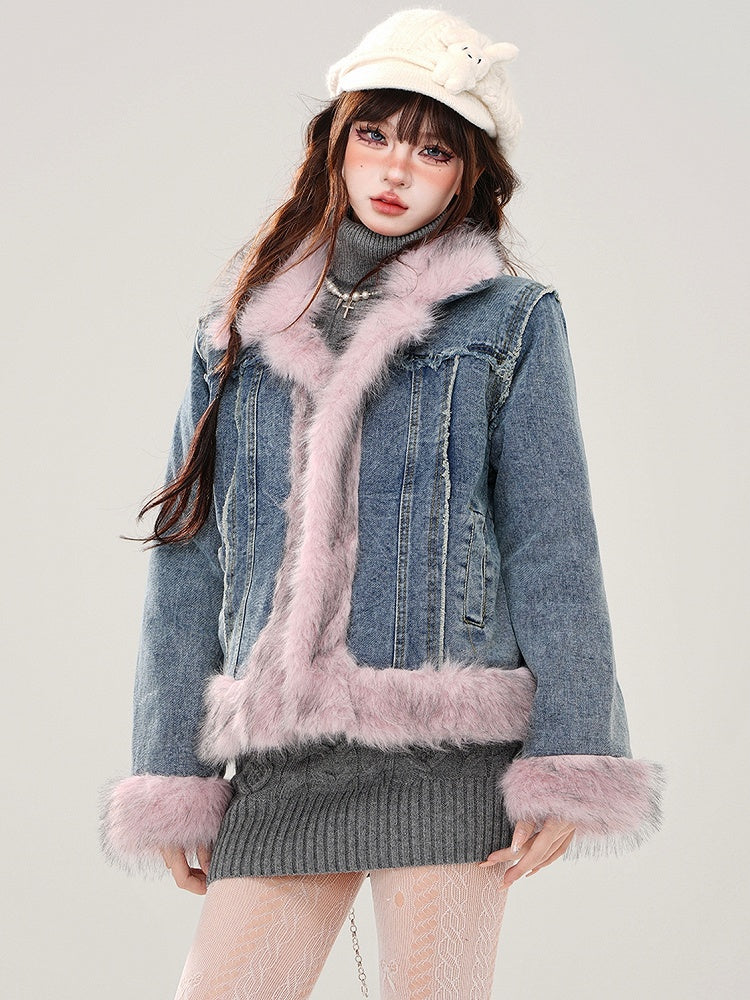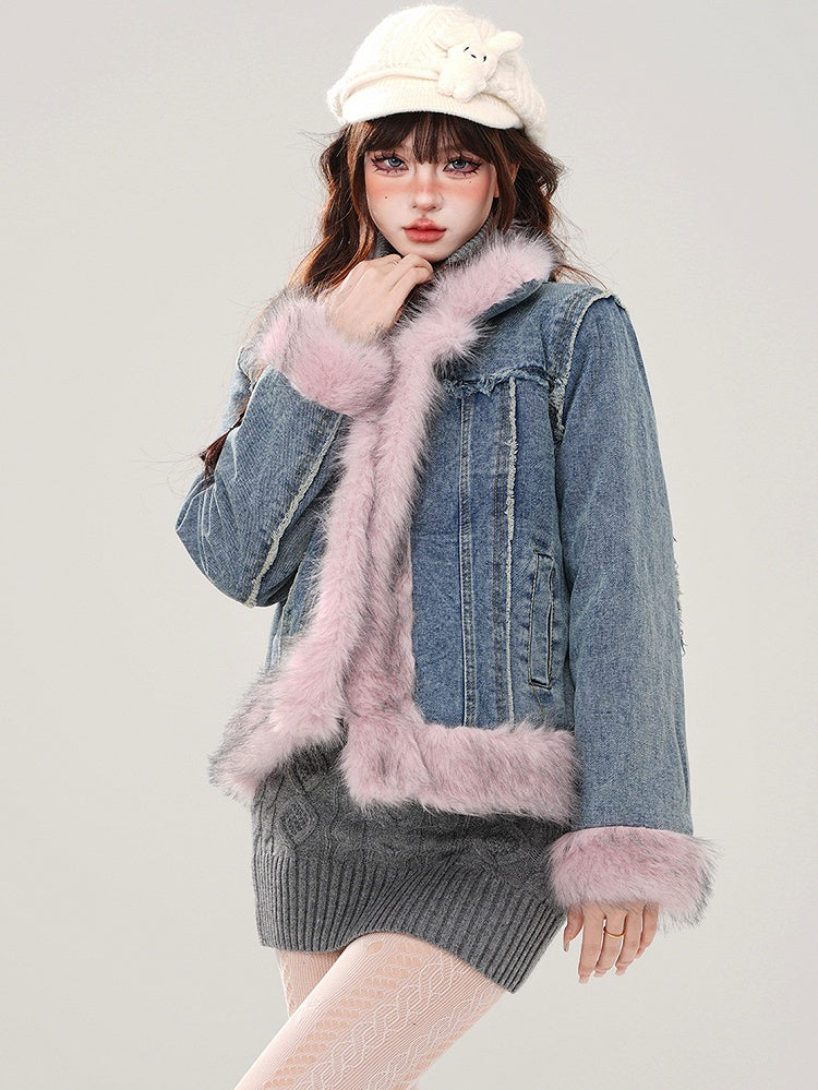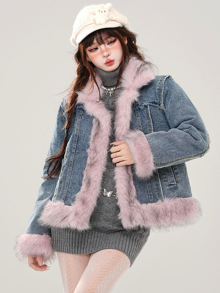 この愛らしいジャケットは、暖かさとスタイリッシュさを兼ね備えた、ふわふわのブルーのフェイクファーの裏地付き。厚手のデニム素材は耐久性と快適性を兼ね備えています。この素敵なアウターで、心地よくキュートな装いを演出しましょう。