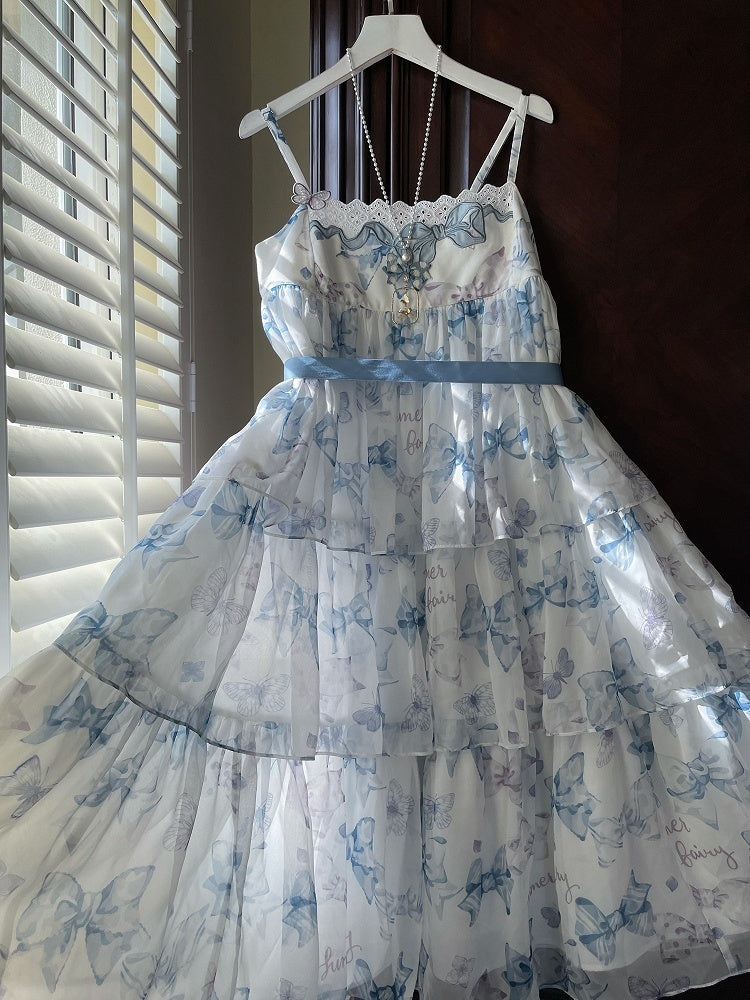 ブルーのハイウエストリボンプリントティアードスカートのサマーロリータドレスで、あなたの内なるキュートさを解き放ちましょう。ハイウエストデザインとリボンのディテールがボディラインを美しく引き立て、ティアードスカートが遊び心のあるアクセントを添えます。夏にぴったりの、ロリータファッション好きにはたまらないマストアイテムです。