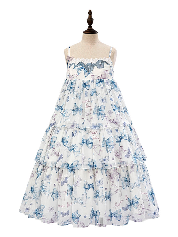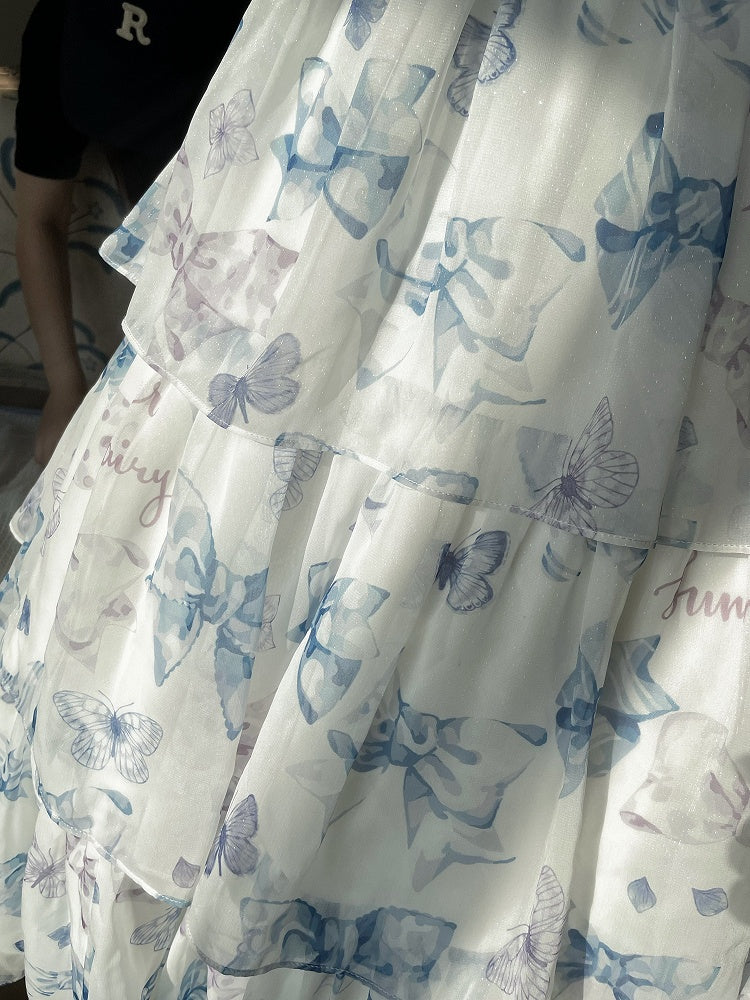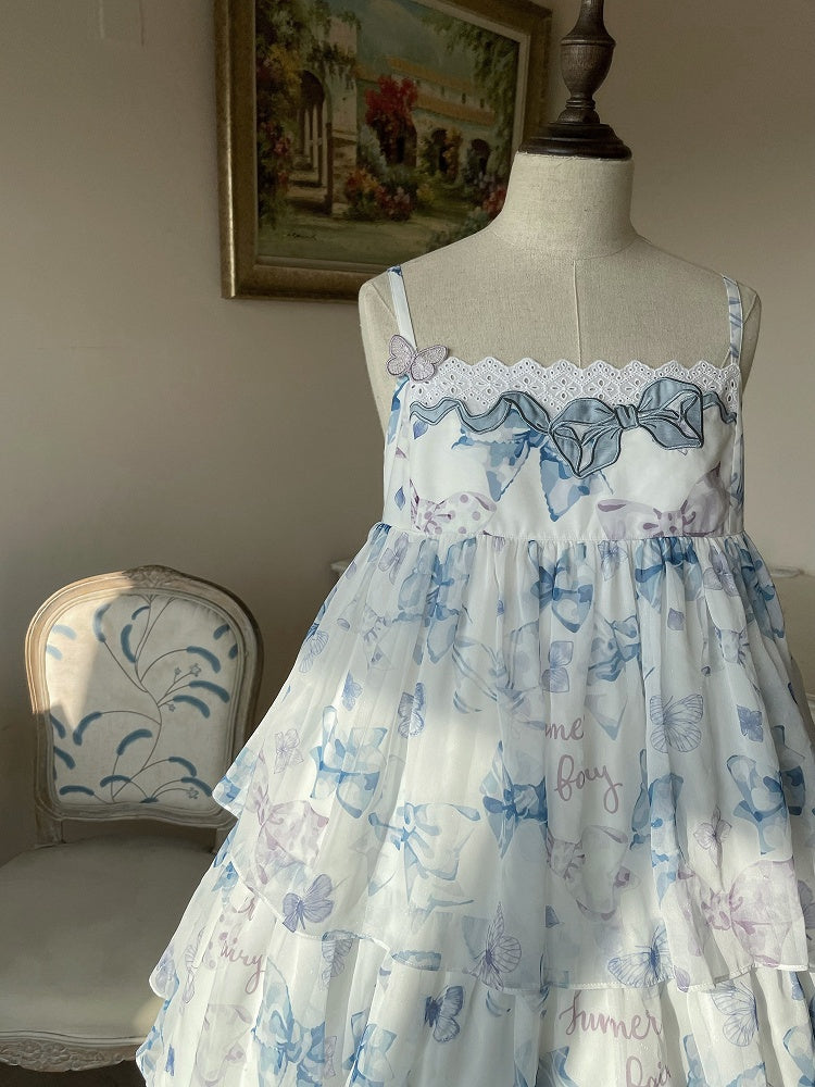 ブルーのハイウエストリボンプリントティアードスカート サマーロリータドレス