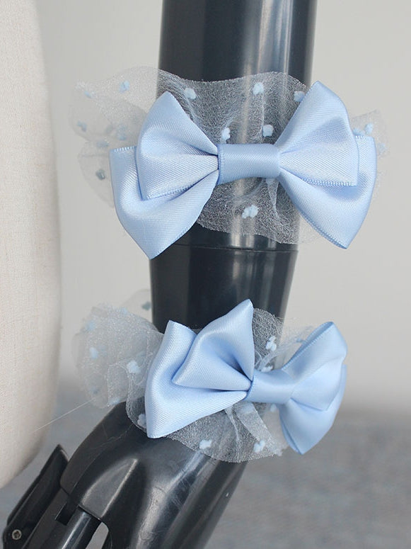 ブルーの蝶結びディテール、水玉模様のレーストリム、手首の袖口