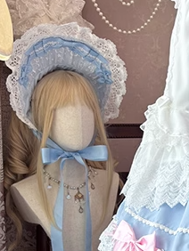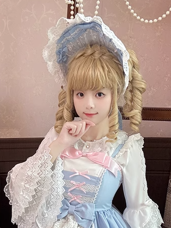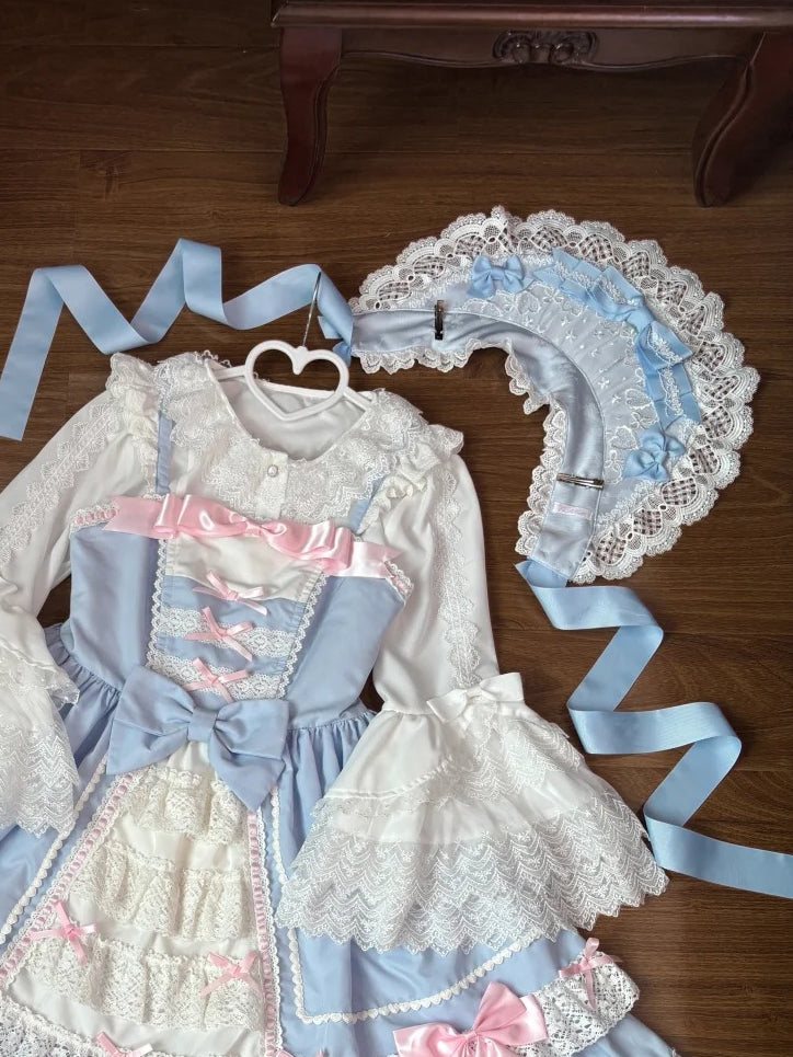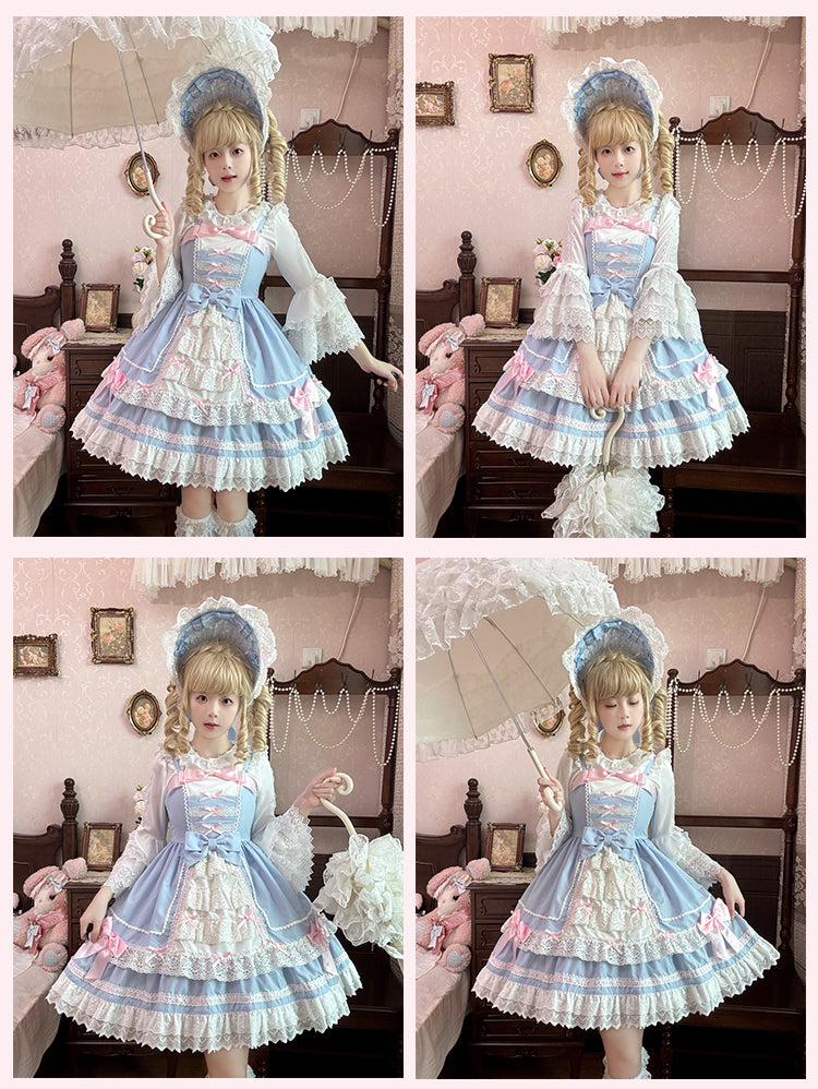 青と白のオールドスクールロリータファッションドレス 蝶結びディテール JSK セット