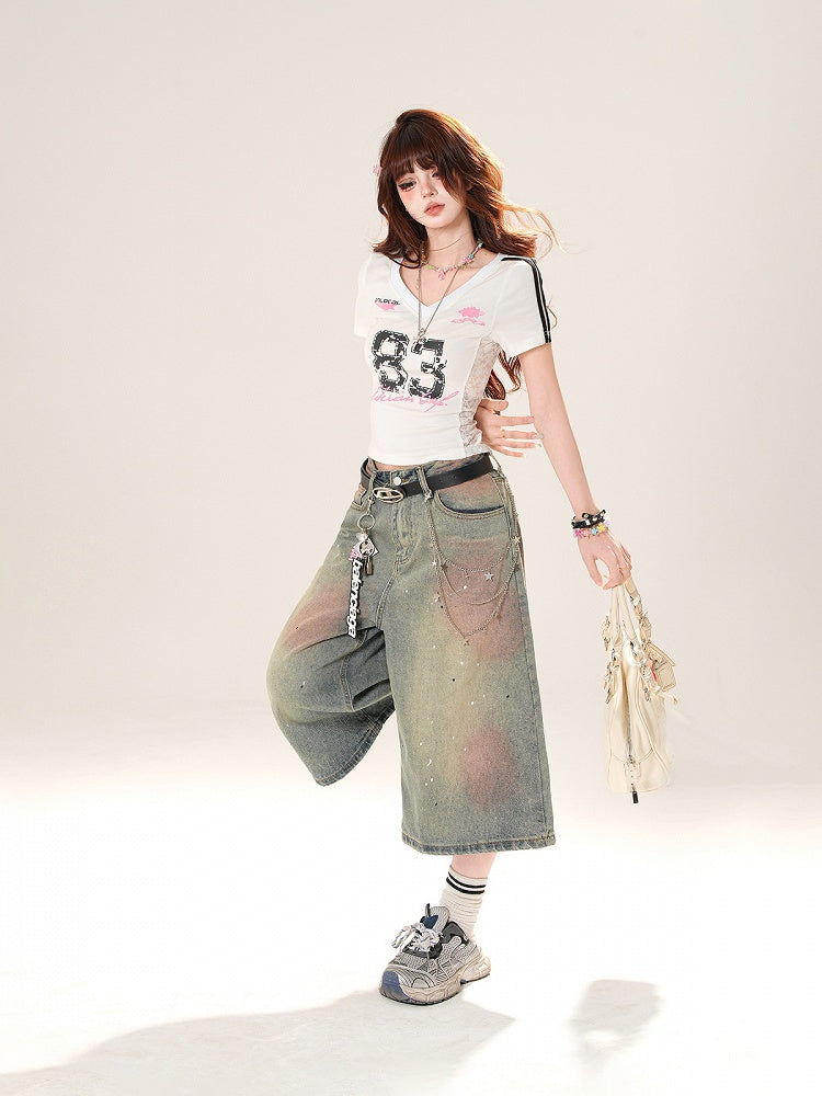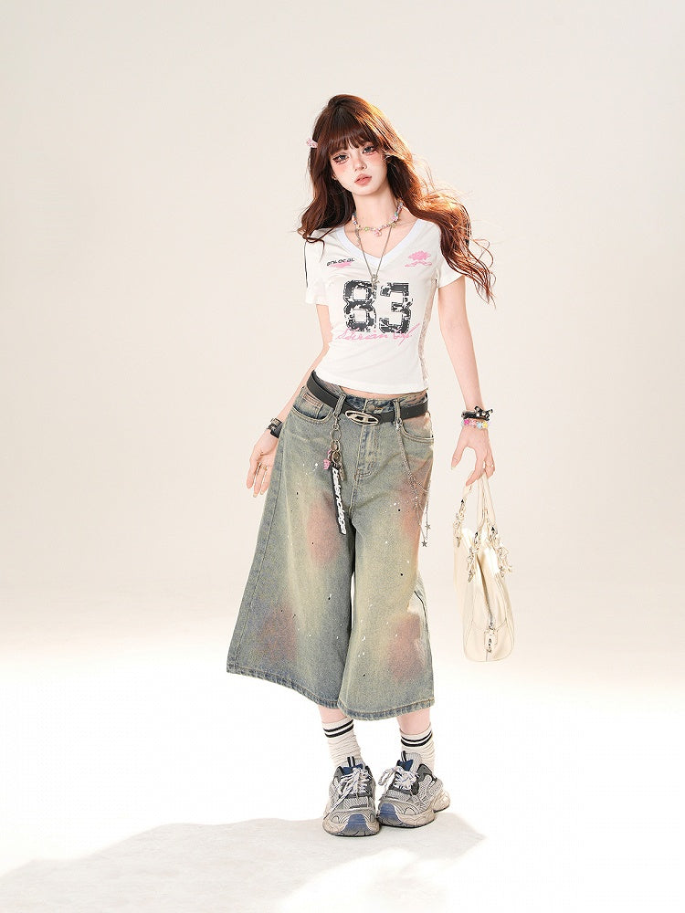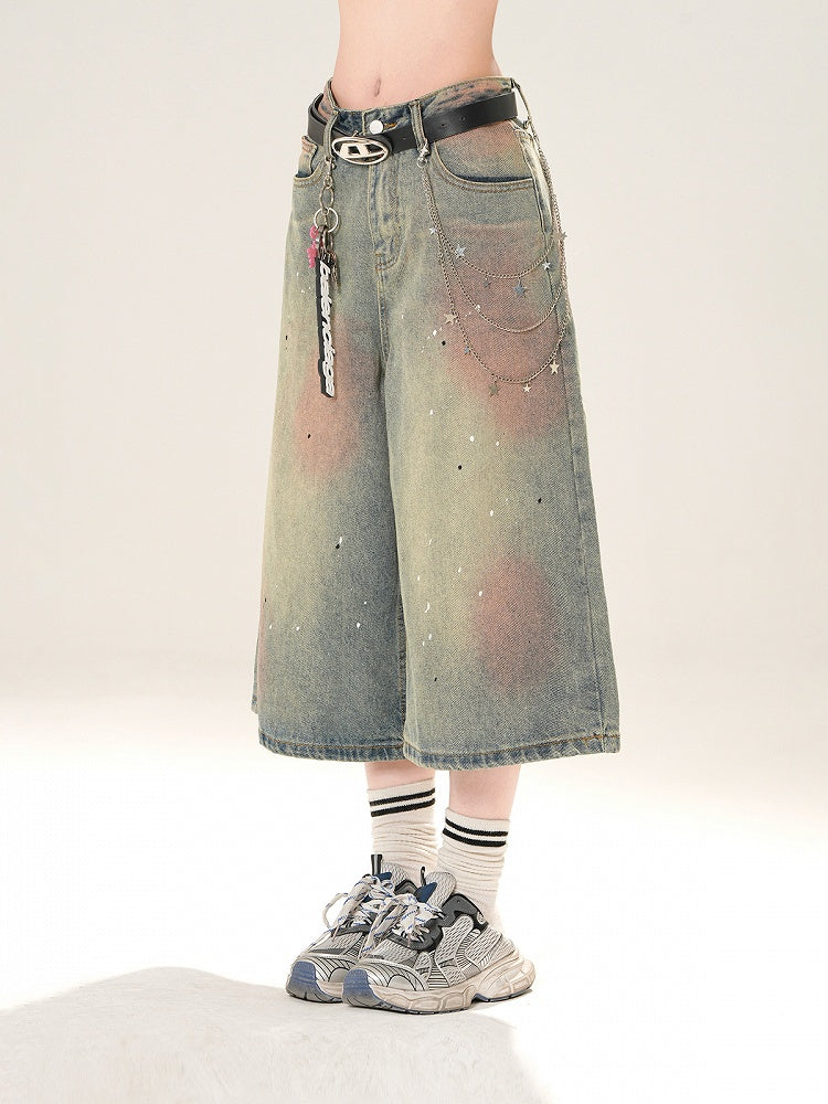 ブルーのローライズ ダメージ加工 スパンコールディテール ストレートレッグジーンズ