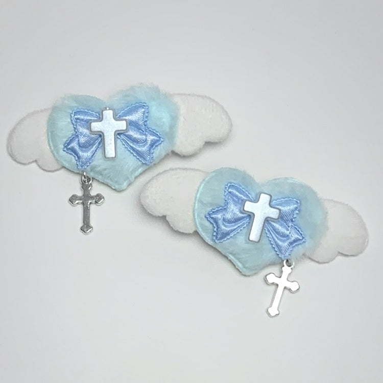 ブルーピンクのプラッシュクロスと蝶結びのハート型ヘアクリップ