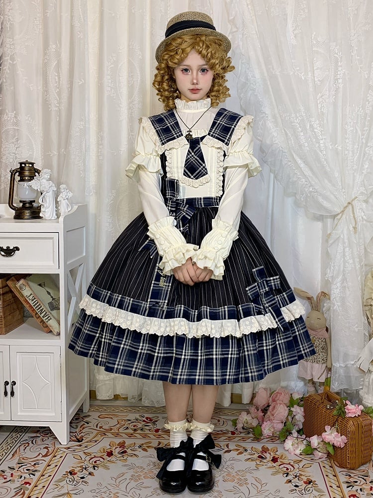 ブルーのチェック柄とブラックのストライプ柄ドレス、取り外し可能な襟とネクタイ付きロリータジャンパースカート